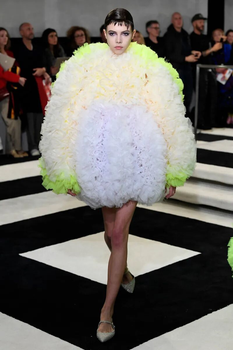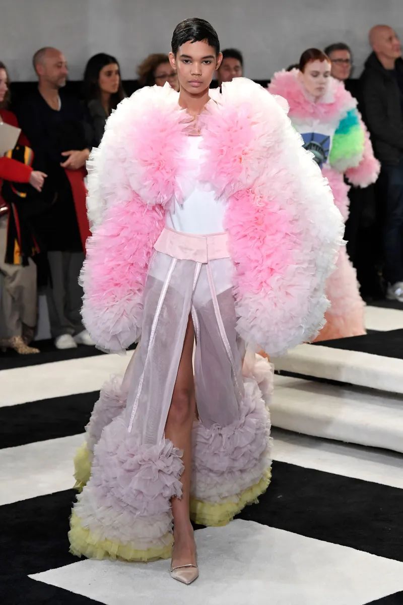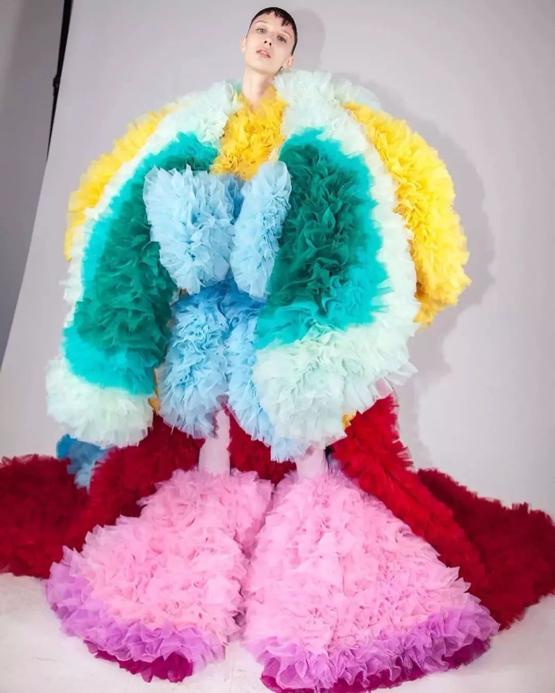 Tomo Koizumi的美学具有日本设计师常见的高调与浮夸,或许难以令普罗大众所接受,但也成功打造了鲜明的个人特色。他通过薄纱的轻薄质感进行重复利用表现出了仿佛千万层堆叠的服装厚重感,这样的怪诞之美,每一件都令人过目难忘!