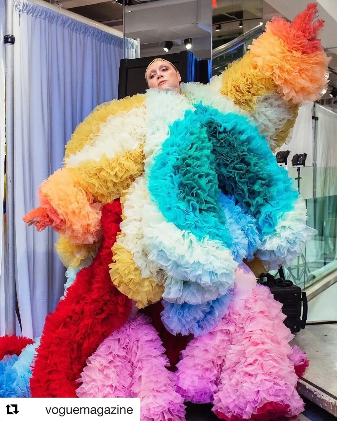 /他以日本丧葬文化、塑料花圈为灵感,制作充斥浪漫死亡色彩的千层蓬蓬裙而一夜爆红!