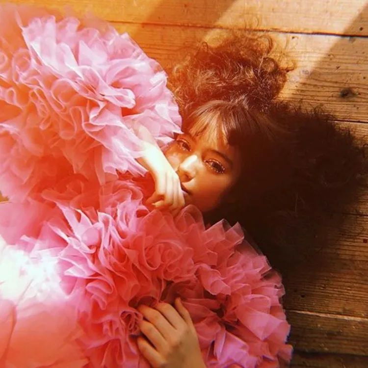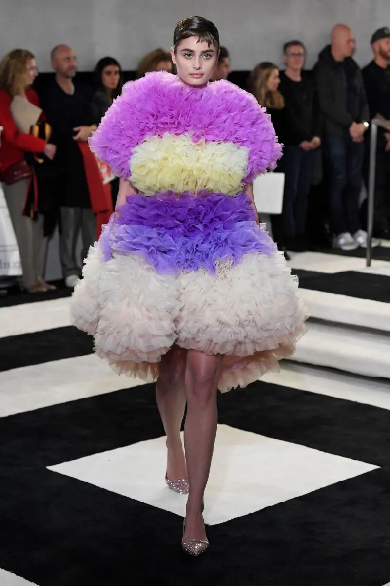 重复,层叠,堆砌Tomo Koizumi手中最为常见的设计手法,打破平整和常规的廓形设计,并将反复缠绕的薄纱编造成体蓬松的糖果色裙装