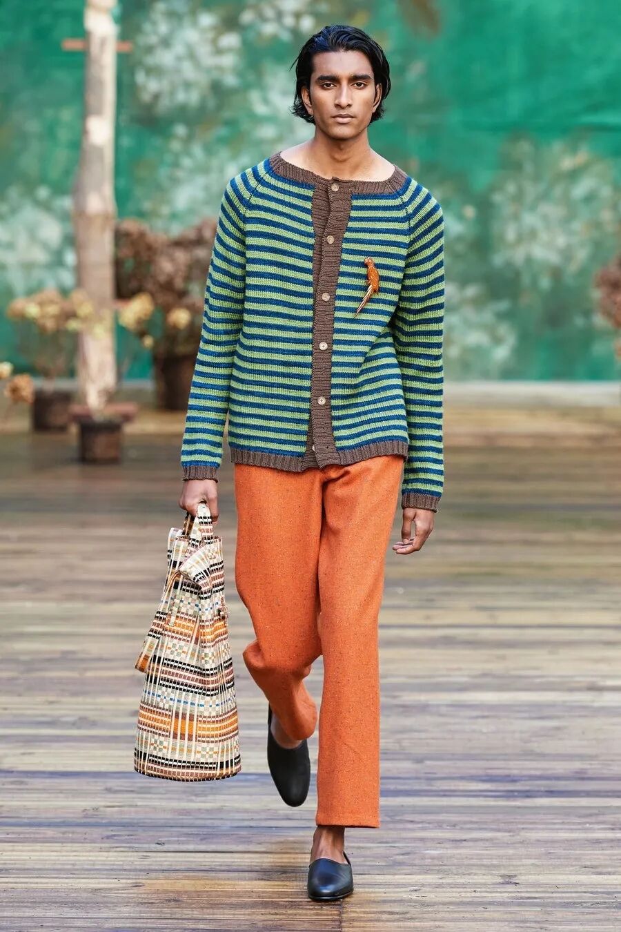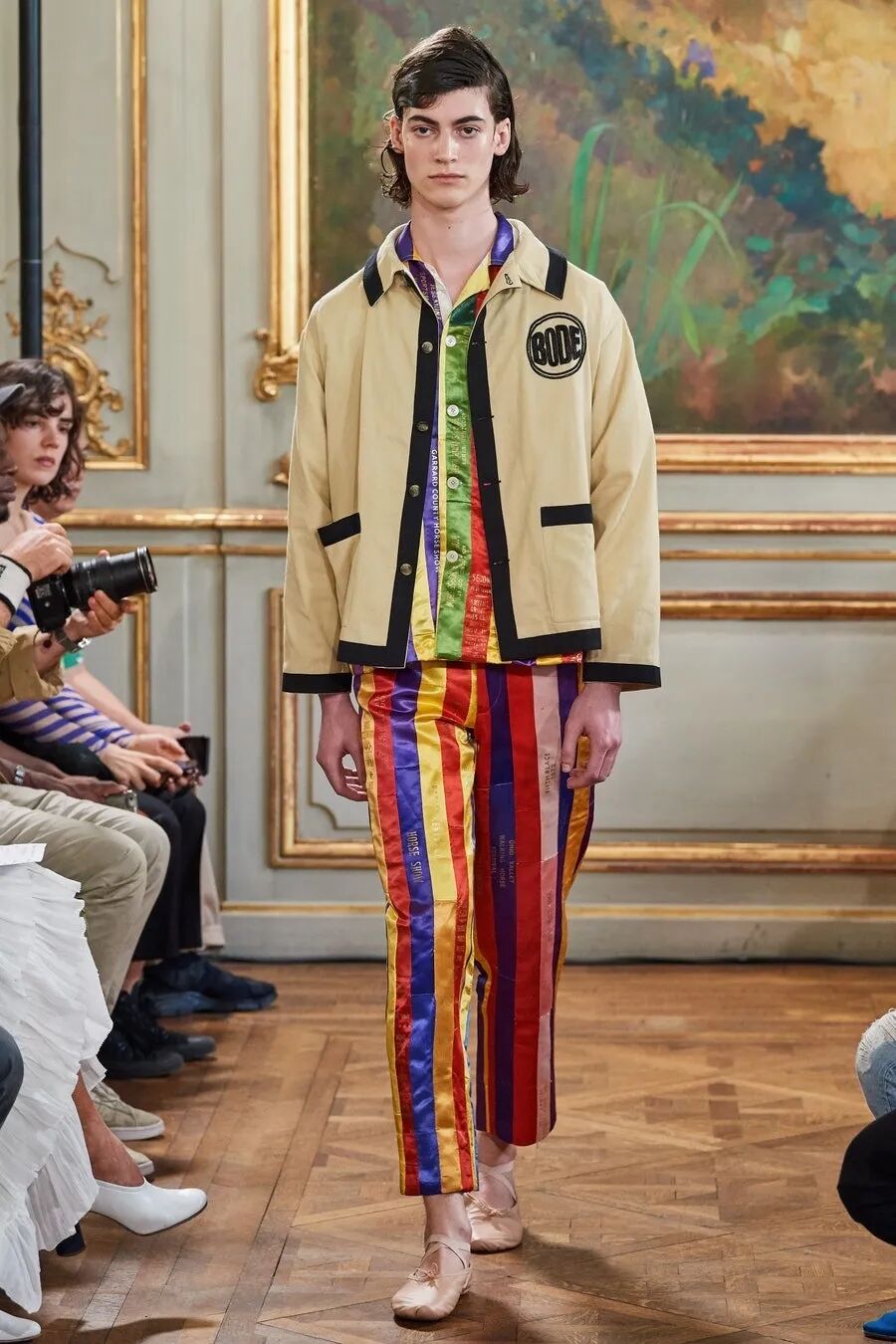 Emily Adams Bode在运用大量色彩的同时,不会将秀的整体搞乱,低饱和的色彩让画面更加的干净。Bode将细节也倾注在手工刺绣上,歪歪扭扭的字体别有一种手工的美感。