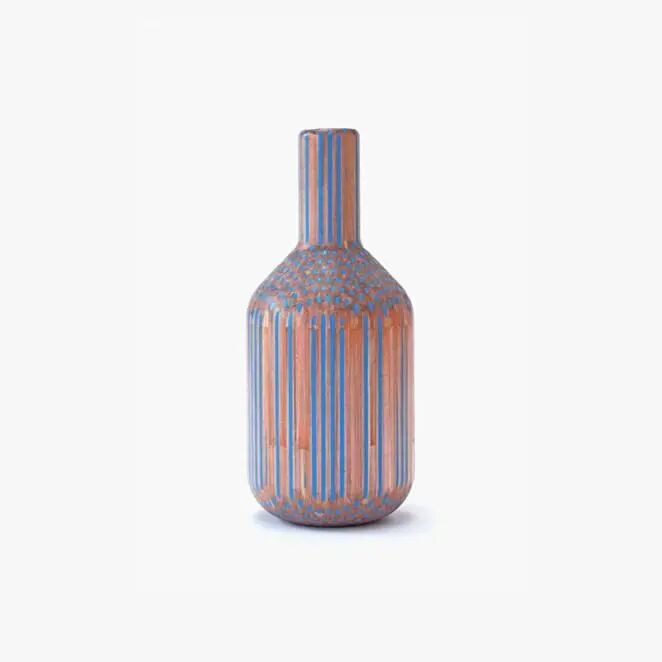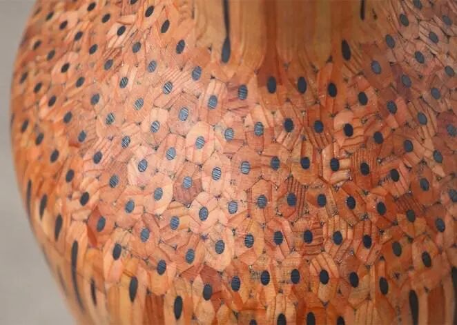 据艺术家介绍,由于制作铅笔花瓶的造型大小不一,使用的铅笔数量在100根到300根左右不等,由于铅笔自身的木制条纹,在经过机床切割后,看起来就像是由陶土烧制的瓷器一般,而铅笔的黑色和彩色笔芯,就像是用釉涂抹的色彩一样。