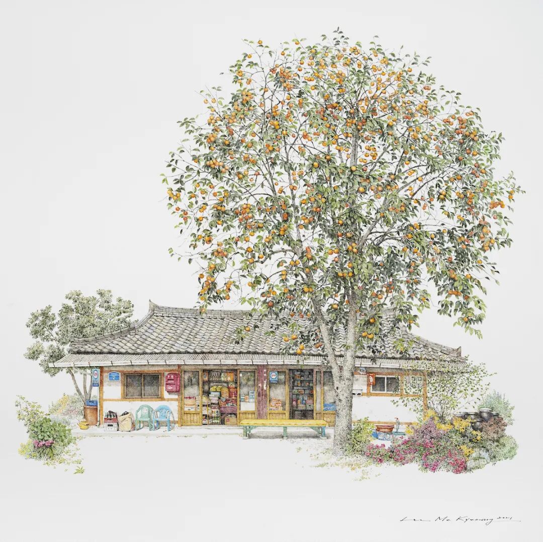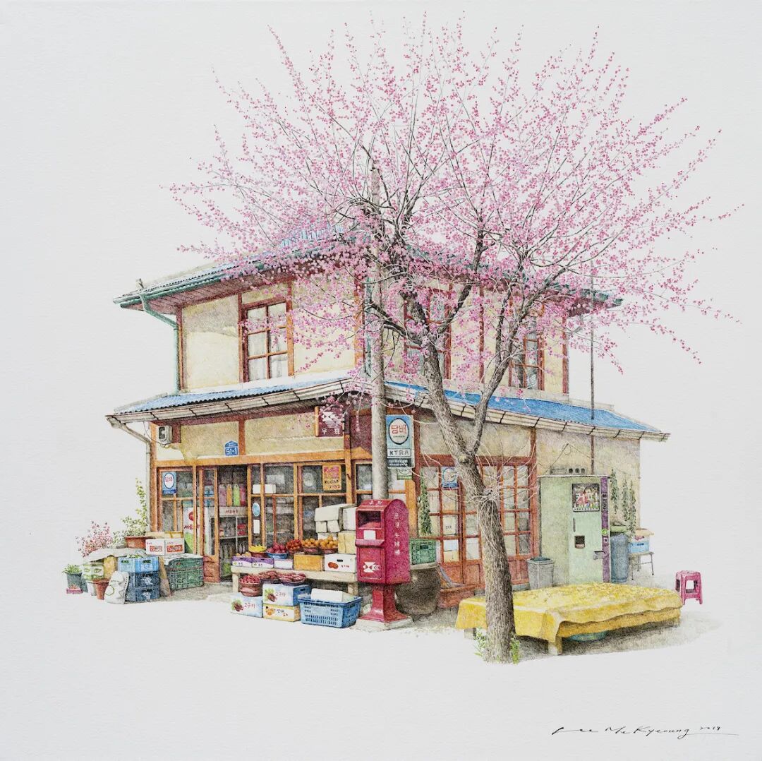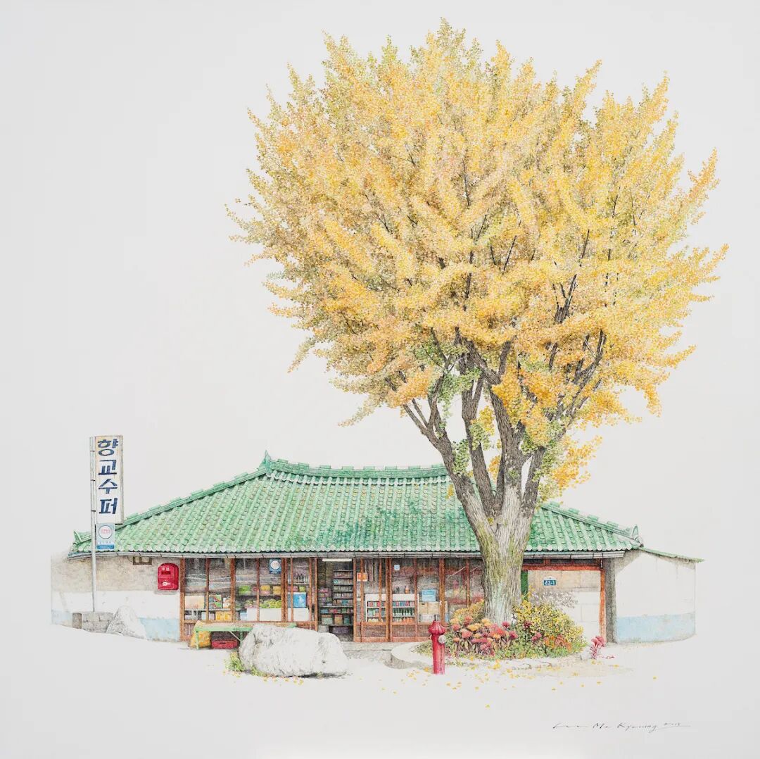 Lee Me Kyeoung将自己记忆中的小便利店,用钢笔描绘了出来,不起眼的小店在鲜明的白色背景下,被几棵树包围着,推拉门外,堆放着新鲜的箱装水果。熟悉感扑面而来,仿佛当我们推开店铺狭窄的门,一下子就能回忆起旧时光,这就是艺术家笔下的小商店的迷人之处。