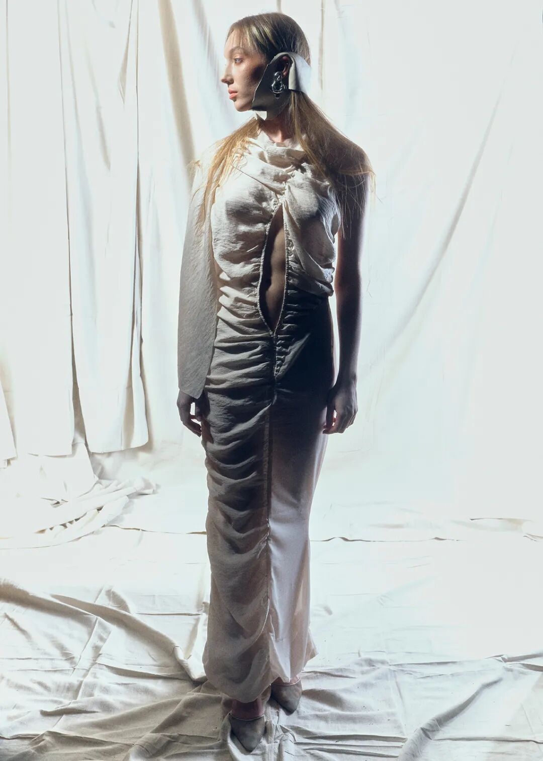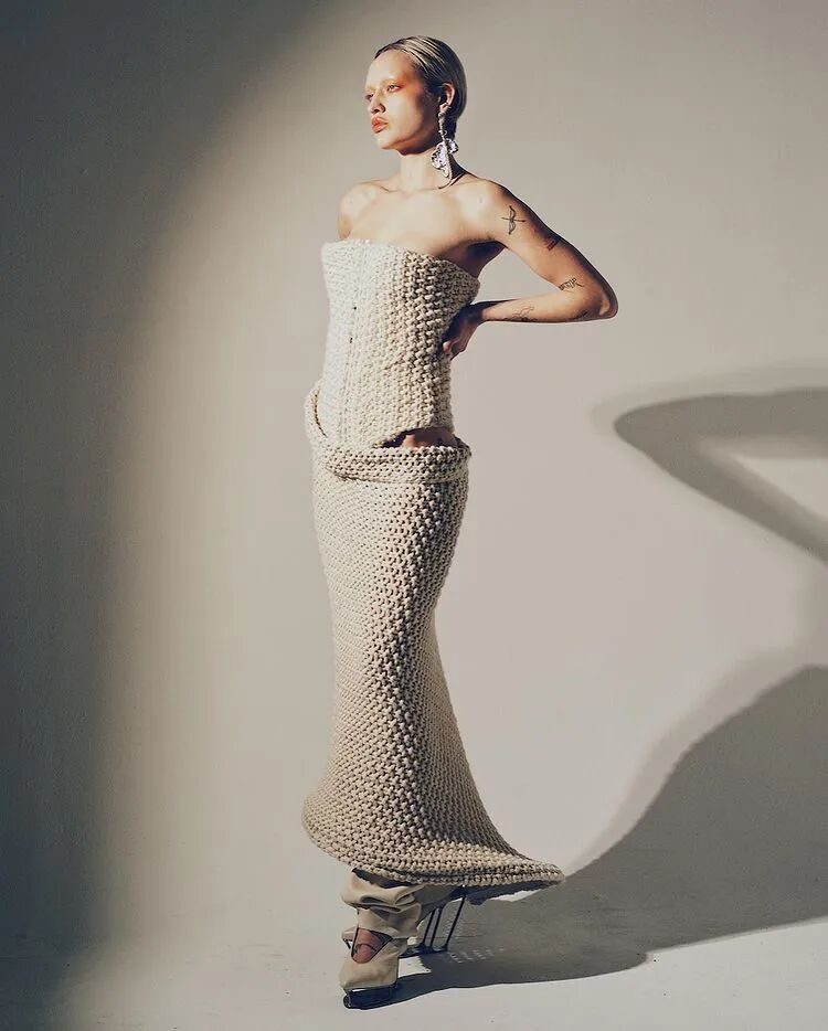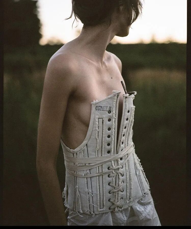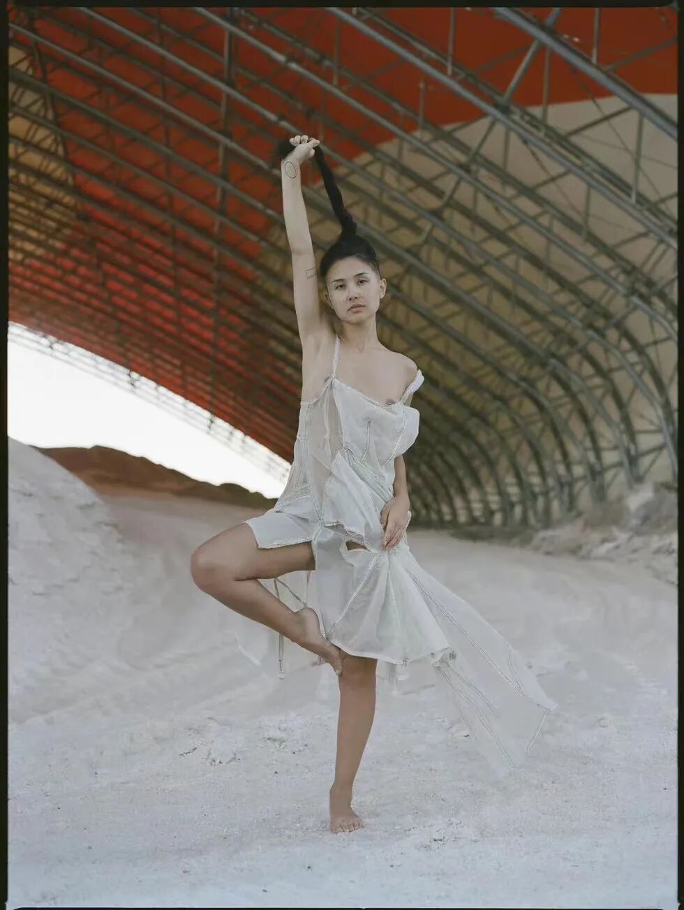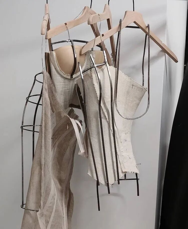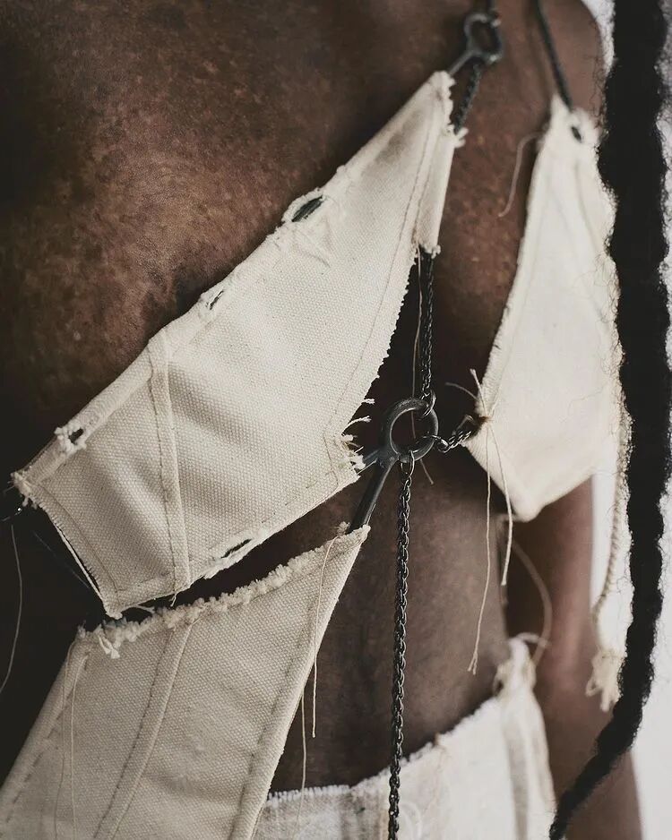 这也是为什么Elena常在作品中使用船帆、麻绳与废弃金属等材料,在象牙色的衣服上染上污垢和棕色的茶水,以及在作品精致且极富女人味的同时,又与建筑工地和制造工厂密切相关——这些经历塑造了她对女性的最初印象。