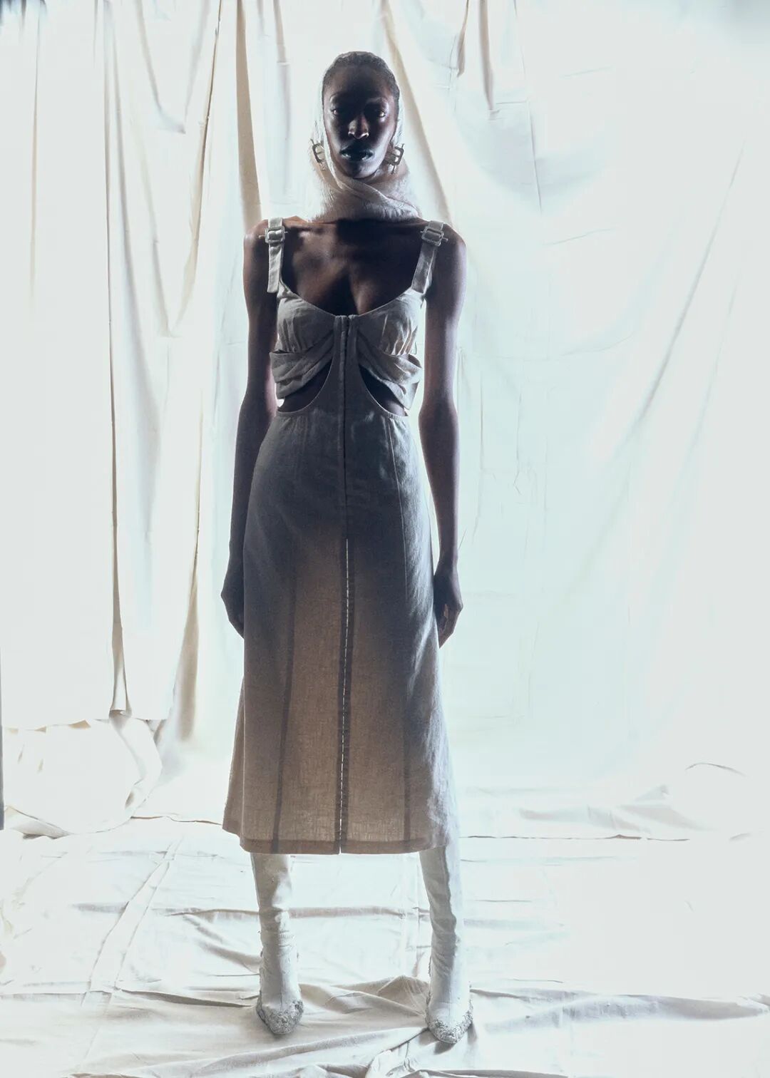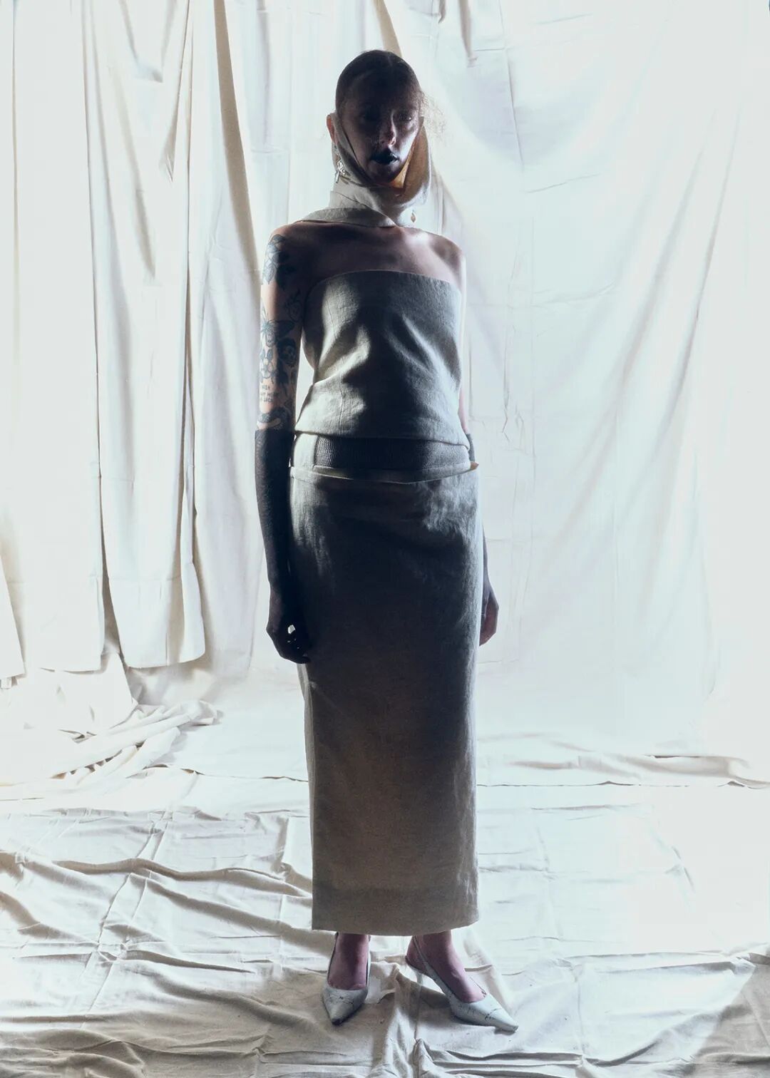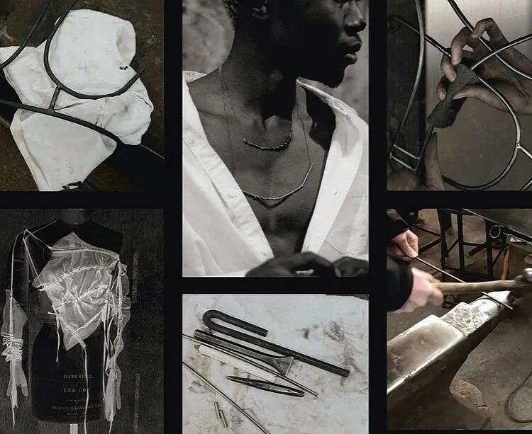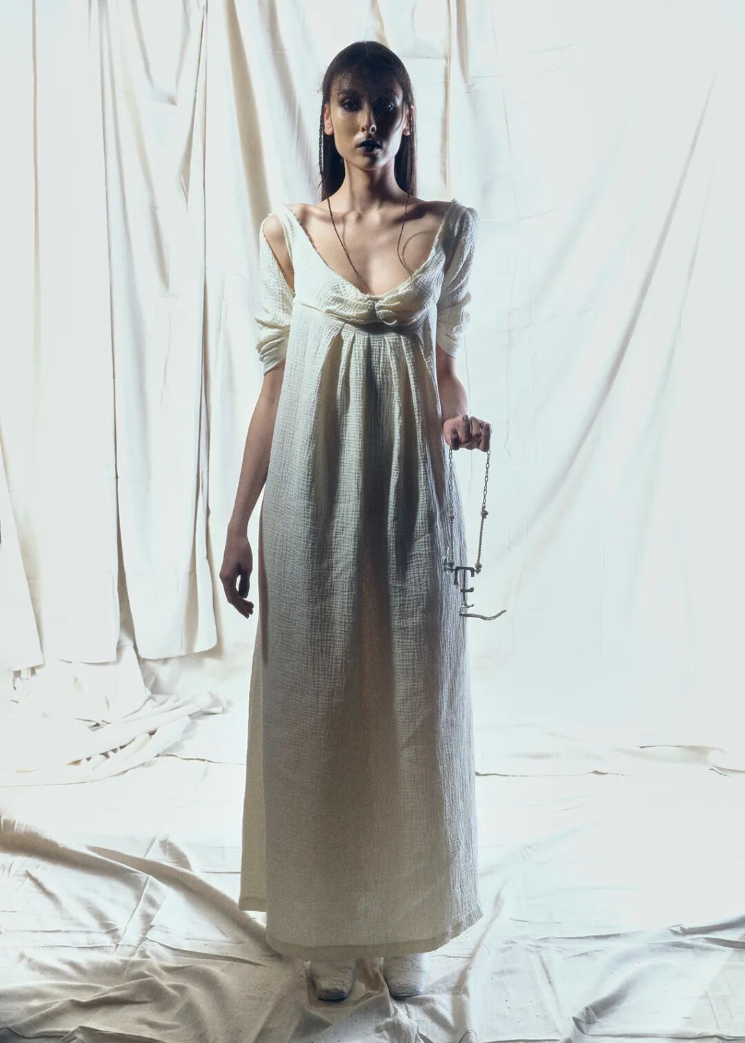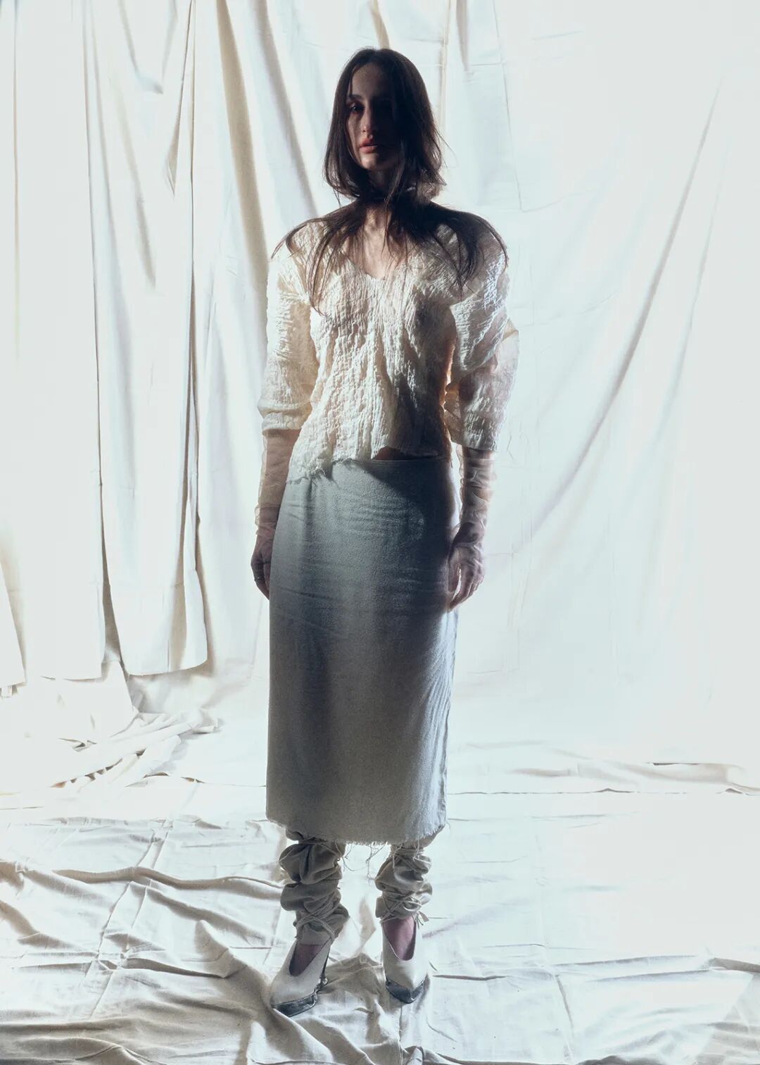 这也是为什么Elena常在作品中使用船帆、麻绳与废弃金属等材料,在象牙色的衣服上染上污垢和棕色的茶水,以及在作品精致且极富女人味的同时,又与建筑工地和制造工厂密切相关——这些经历塑造了她对女性的最初印象。