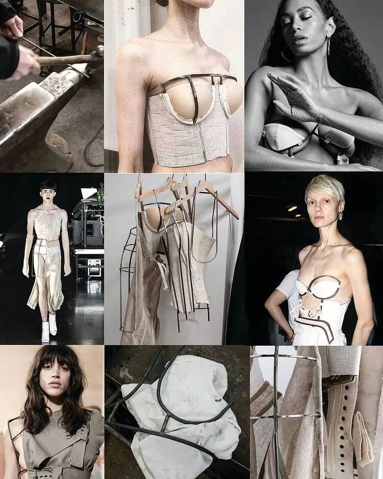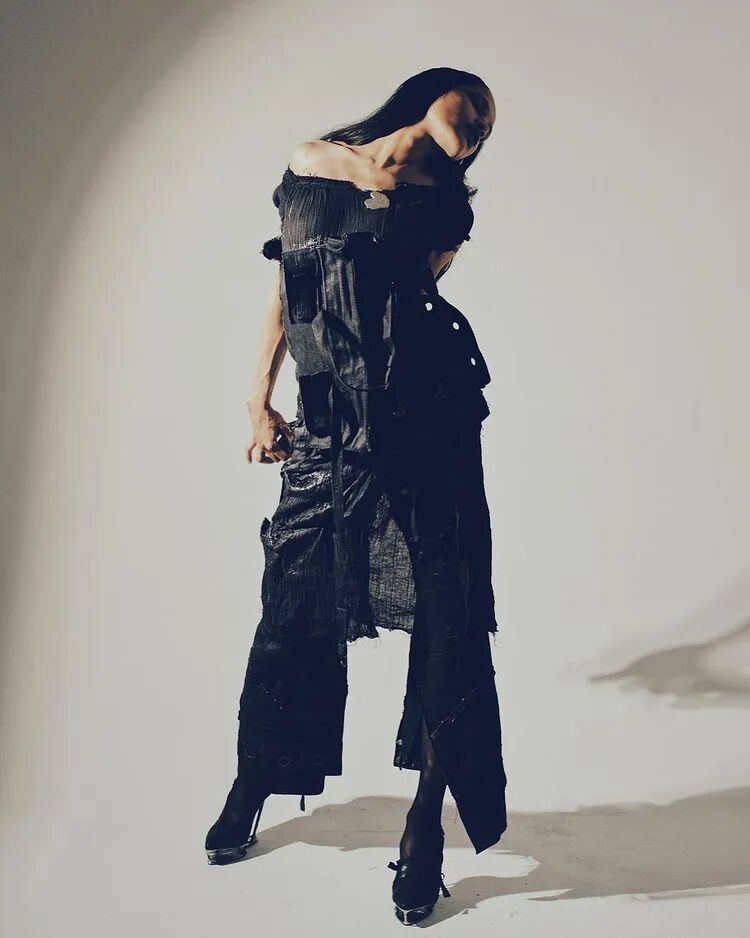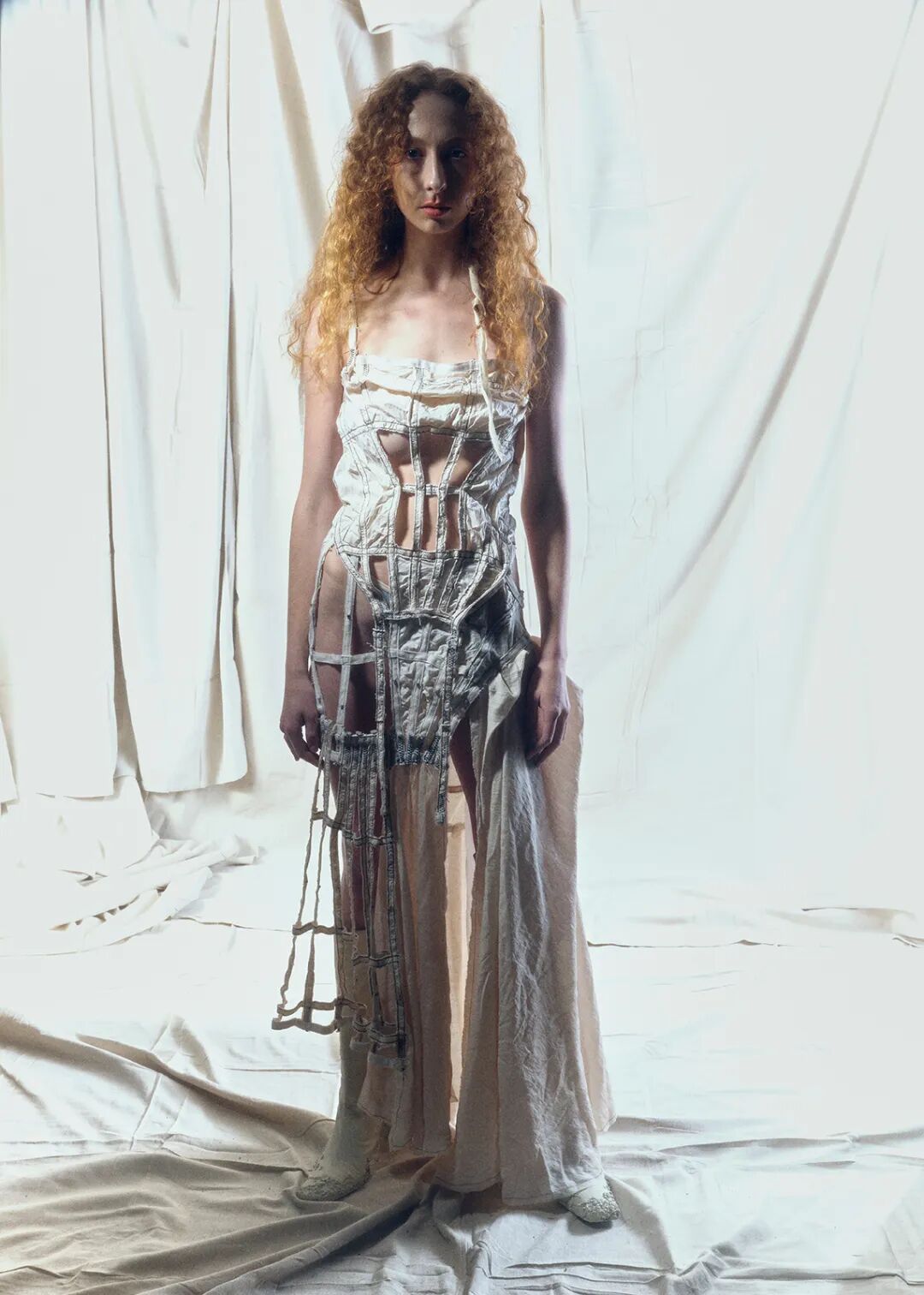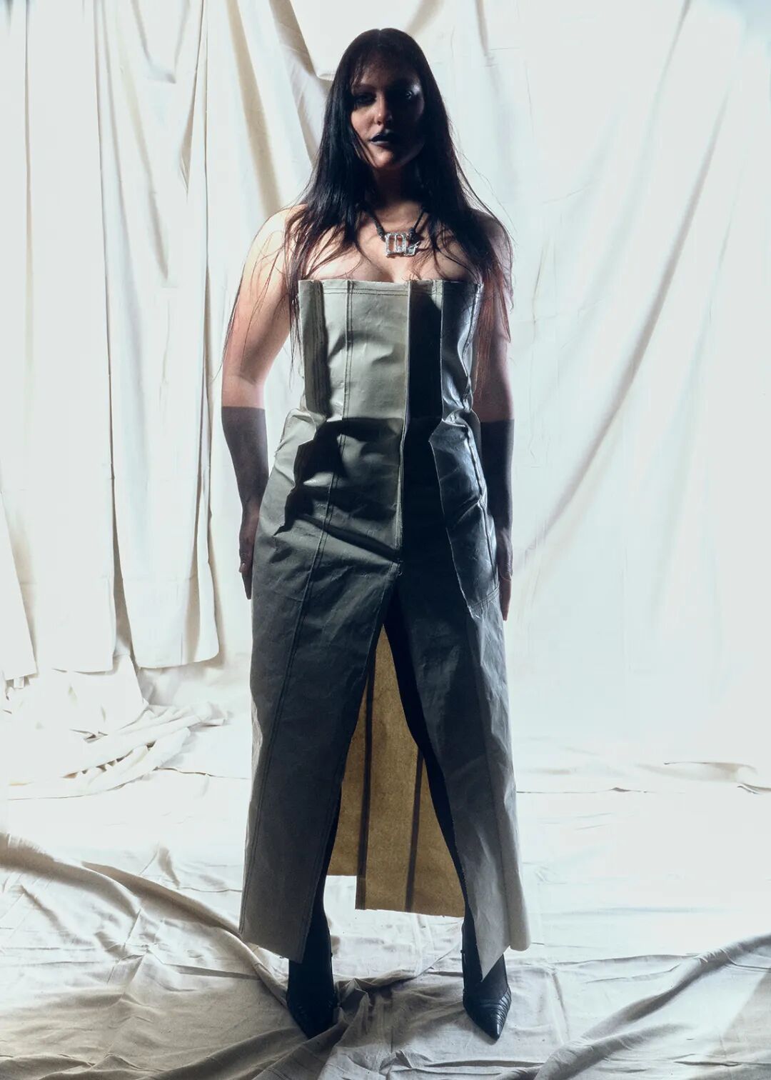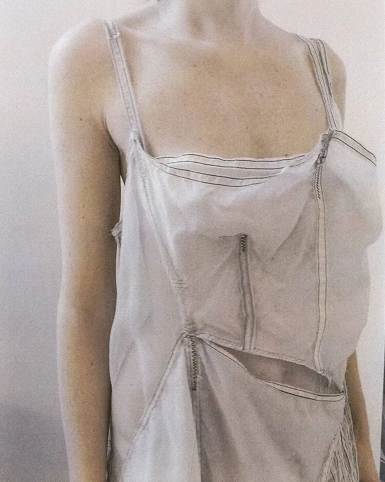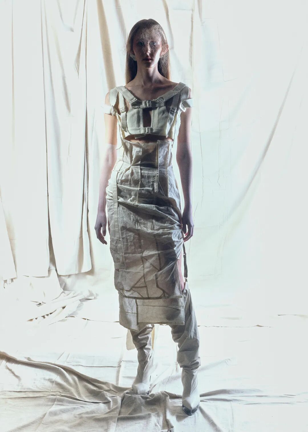 在该系列中,她将旧帆布、丝绸降落伞和废弃金属等融入工业感性之中,以再生面料为特色,尖锐的金属与柔软的面料相对,激进浪漫与颓废感性并存。