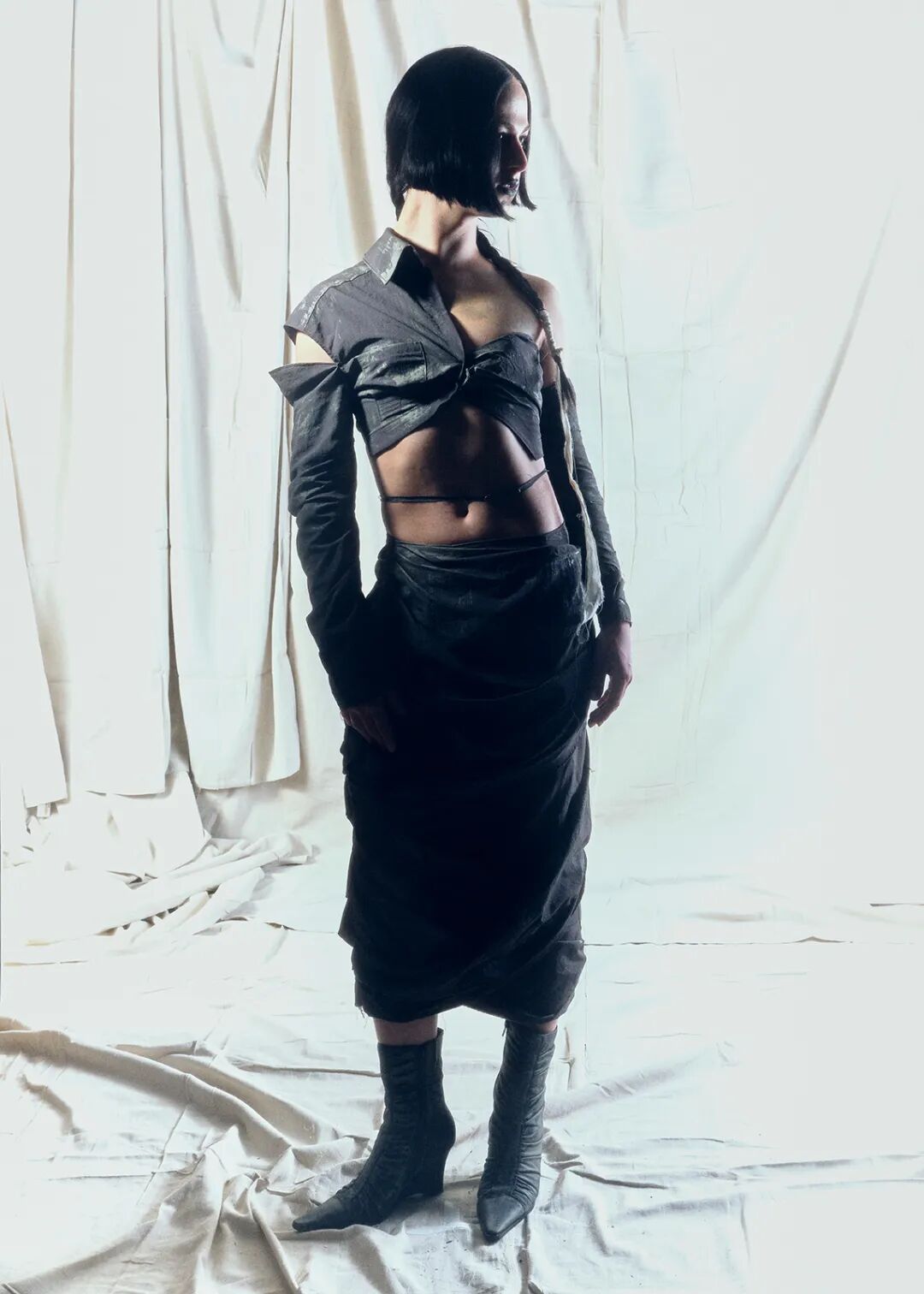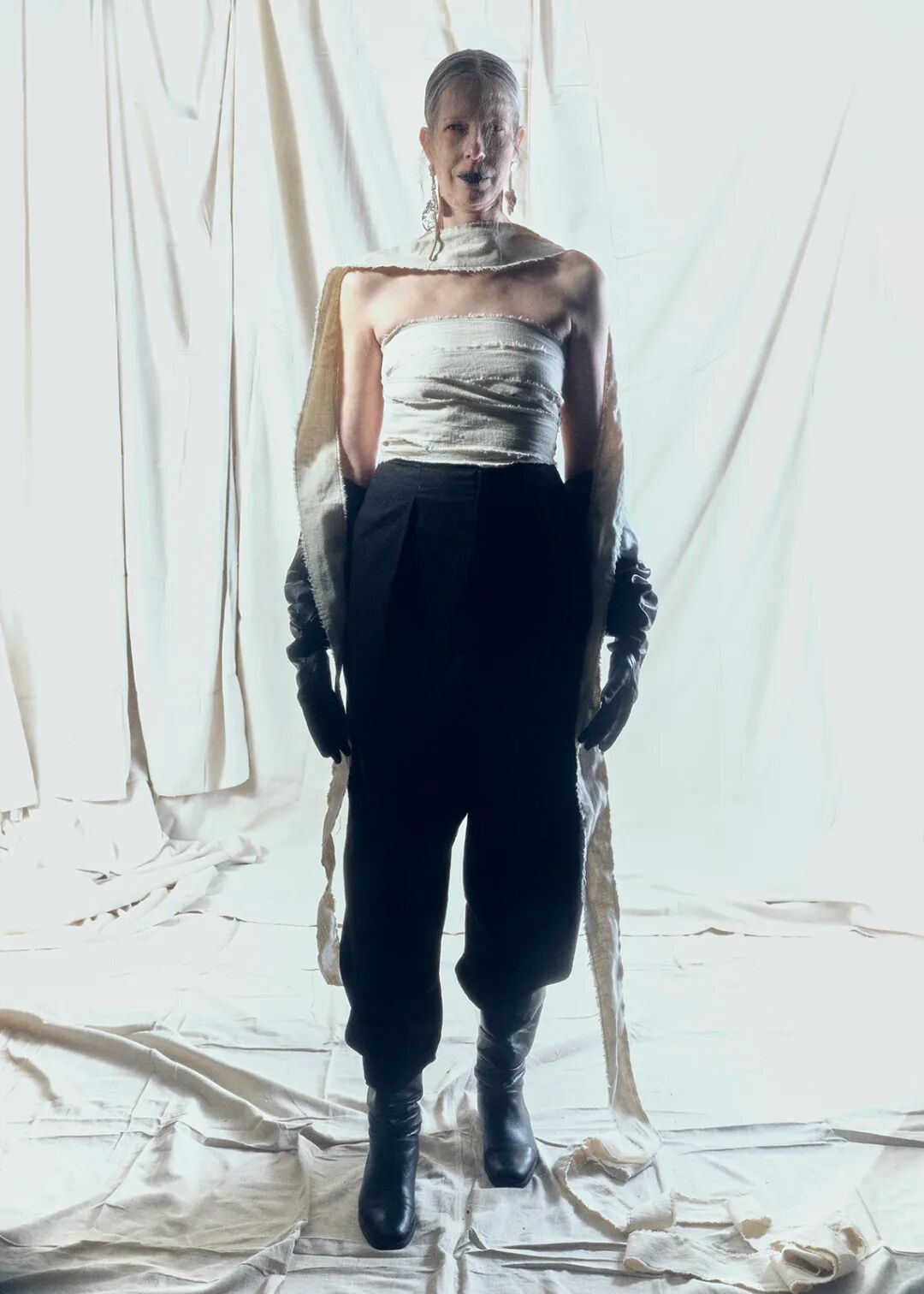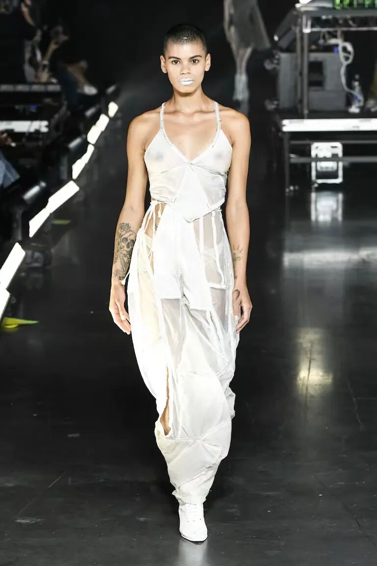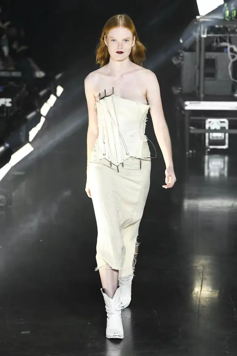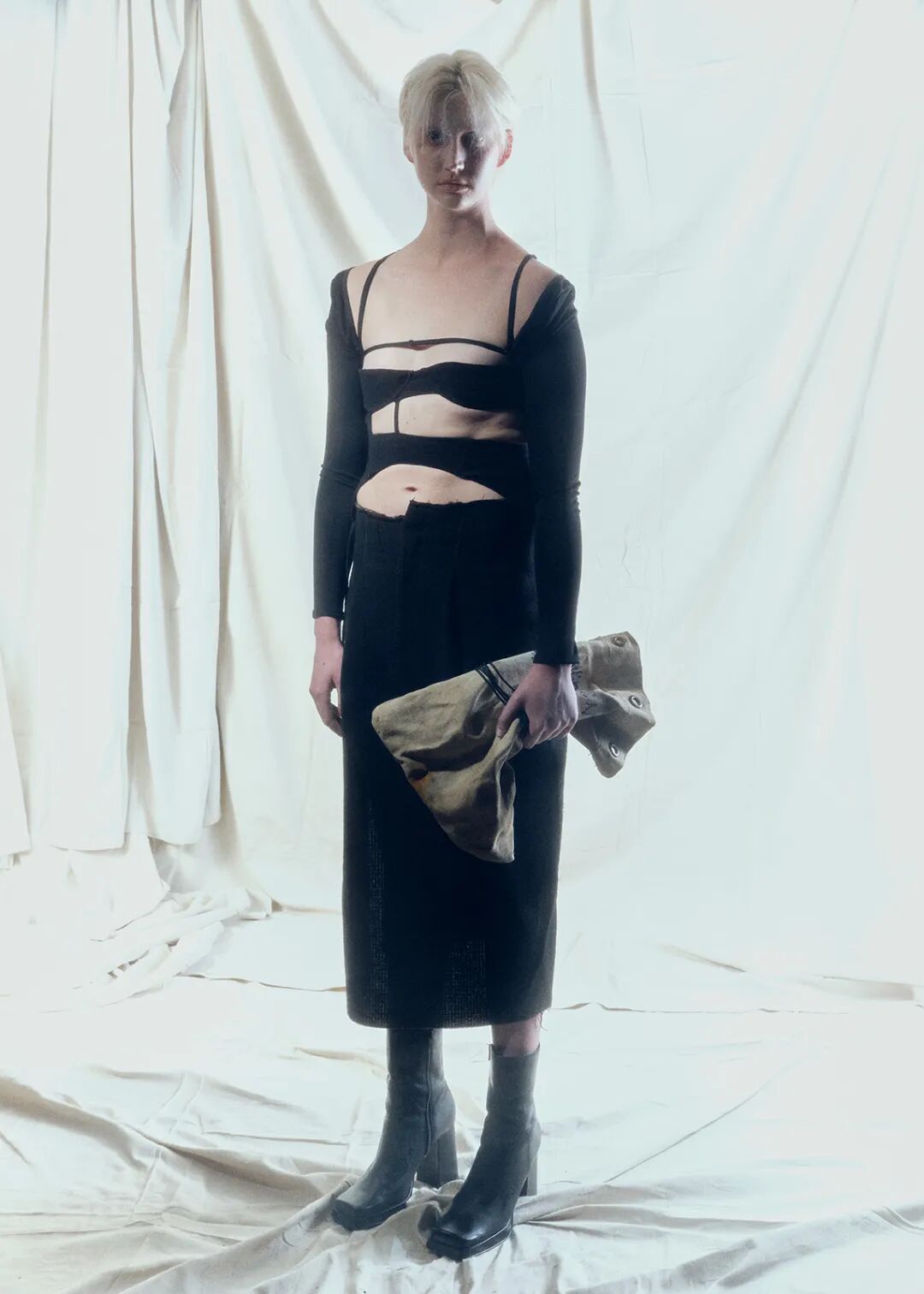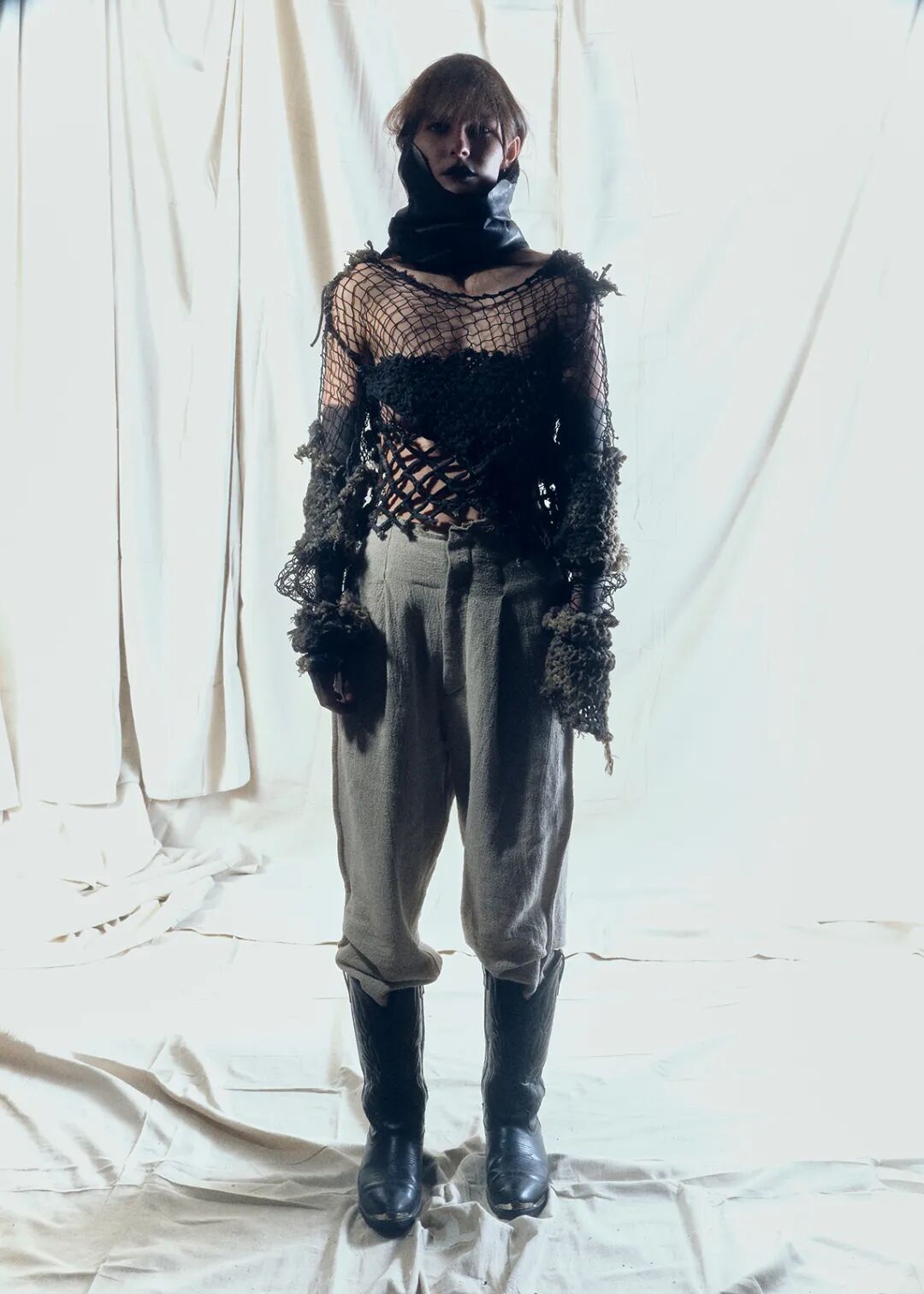 在该系列中,她将旧帆布、丝绸降落伞和废弃金属等融入工业感性之中,以再生面料为特色,尖锐的金属与柔软的面料相对,激进浪漫与颓废感性并存。