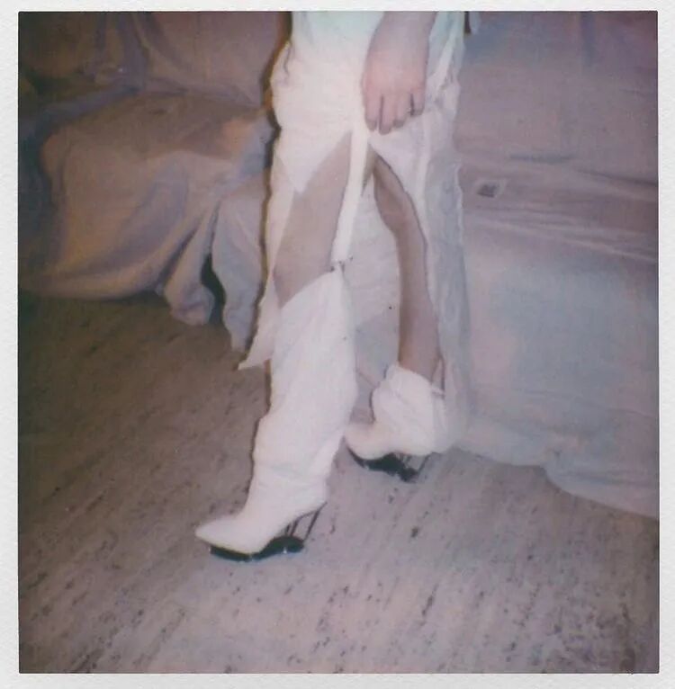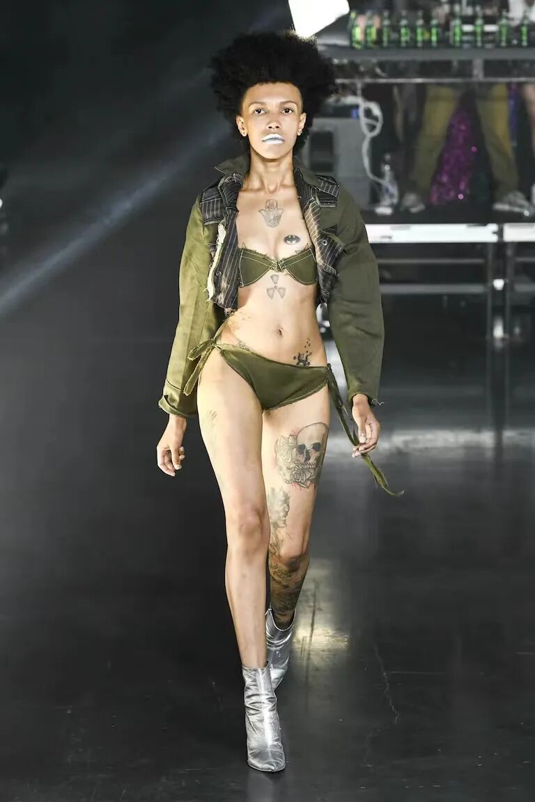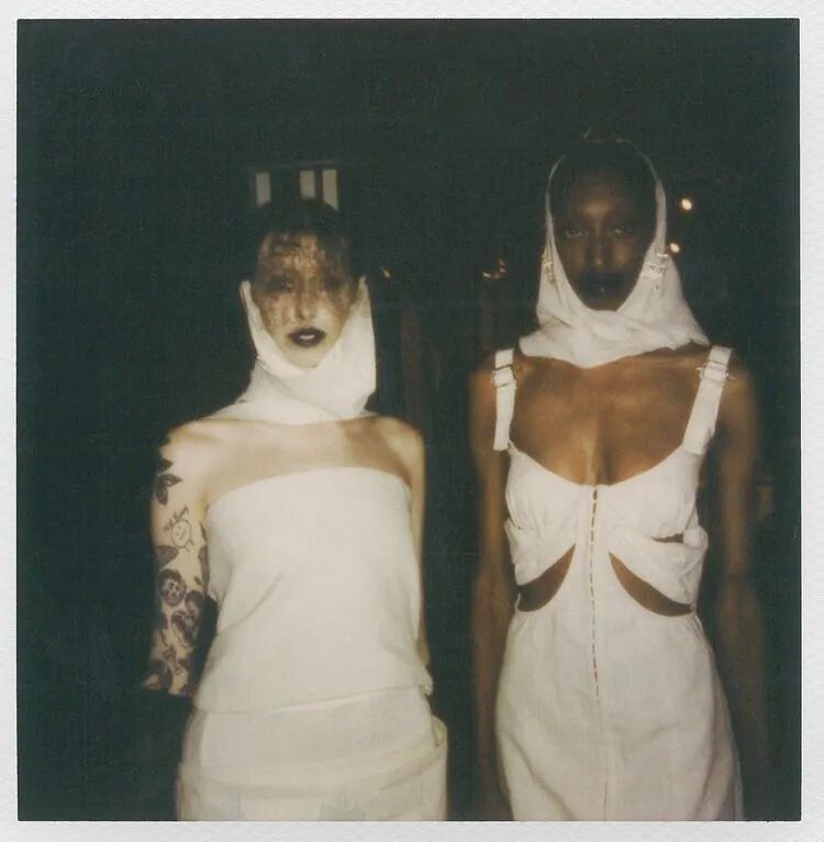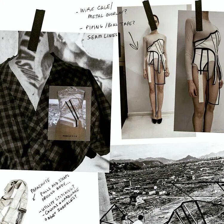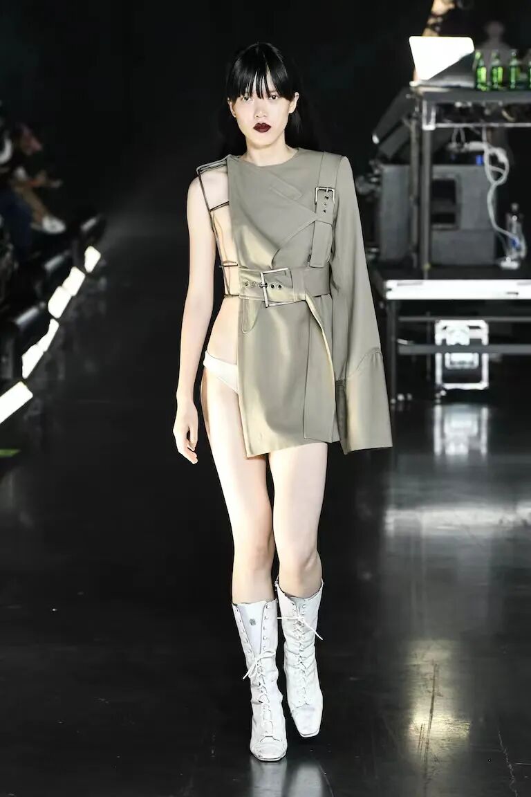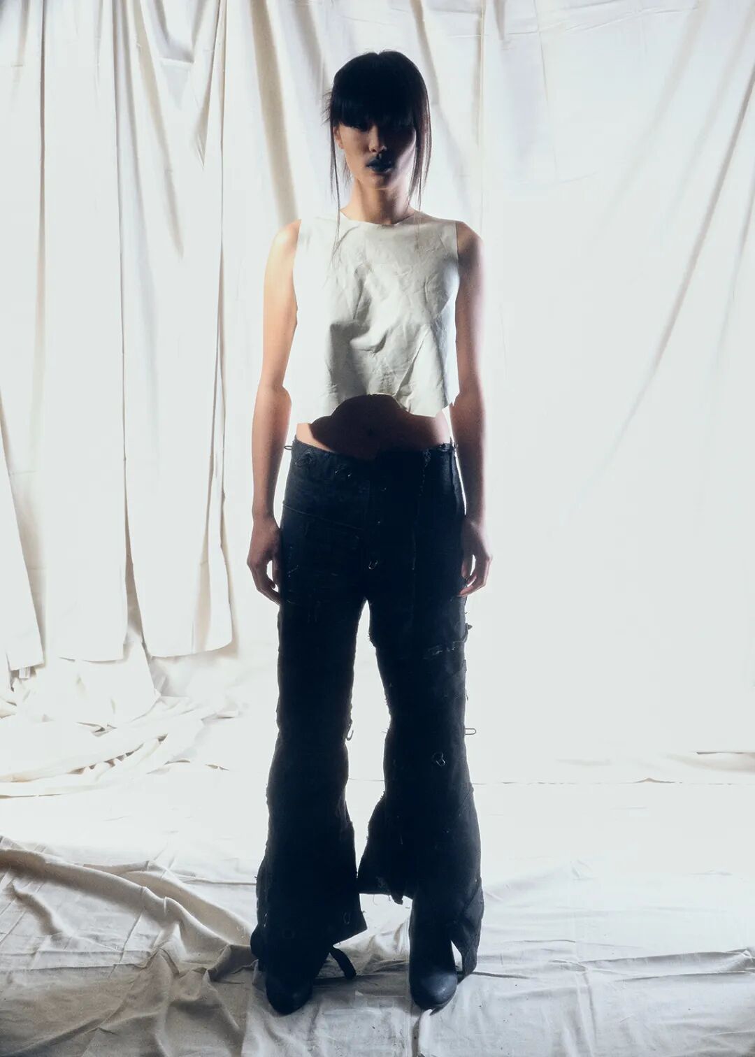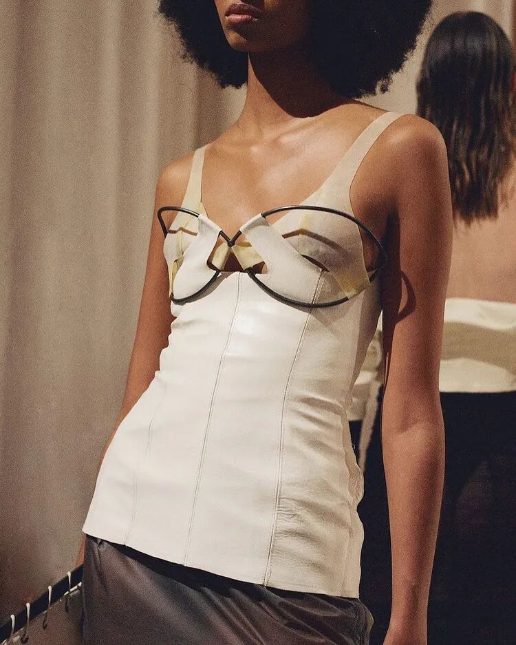 在该系列中,她将旧帆布、丝绸降落伞和废弃金属等融入工业感性之中,以再生面料为特色,尖锐的金属与柔软的面料相对,激进浪漫与颓废感性并存。