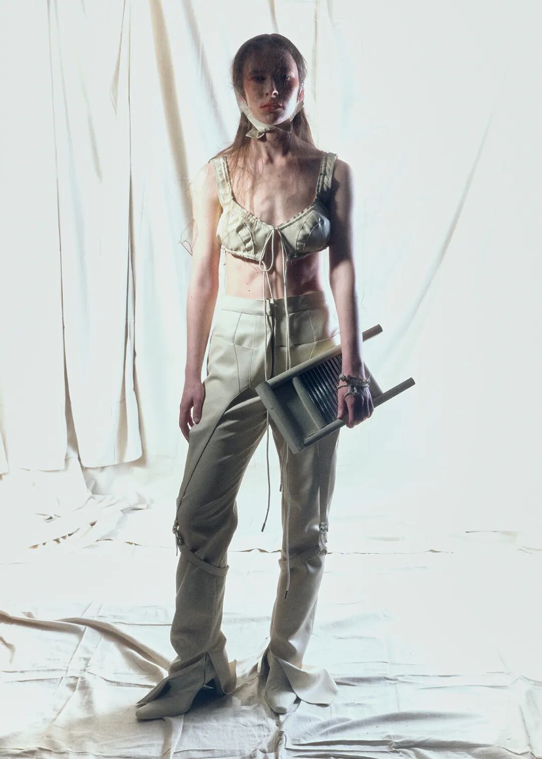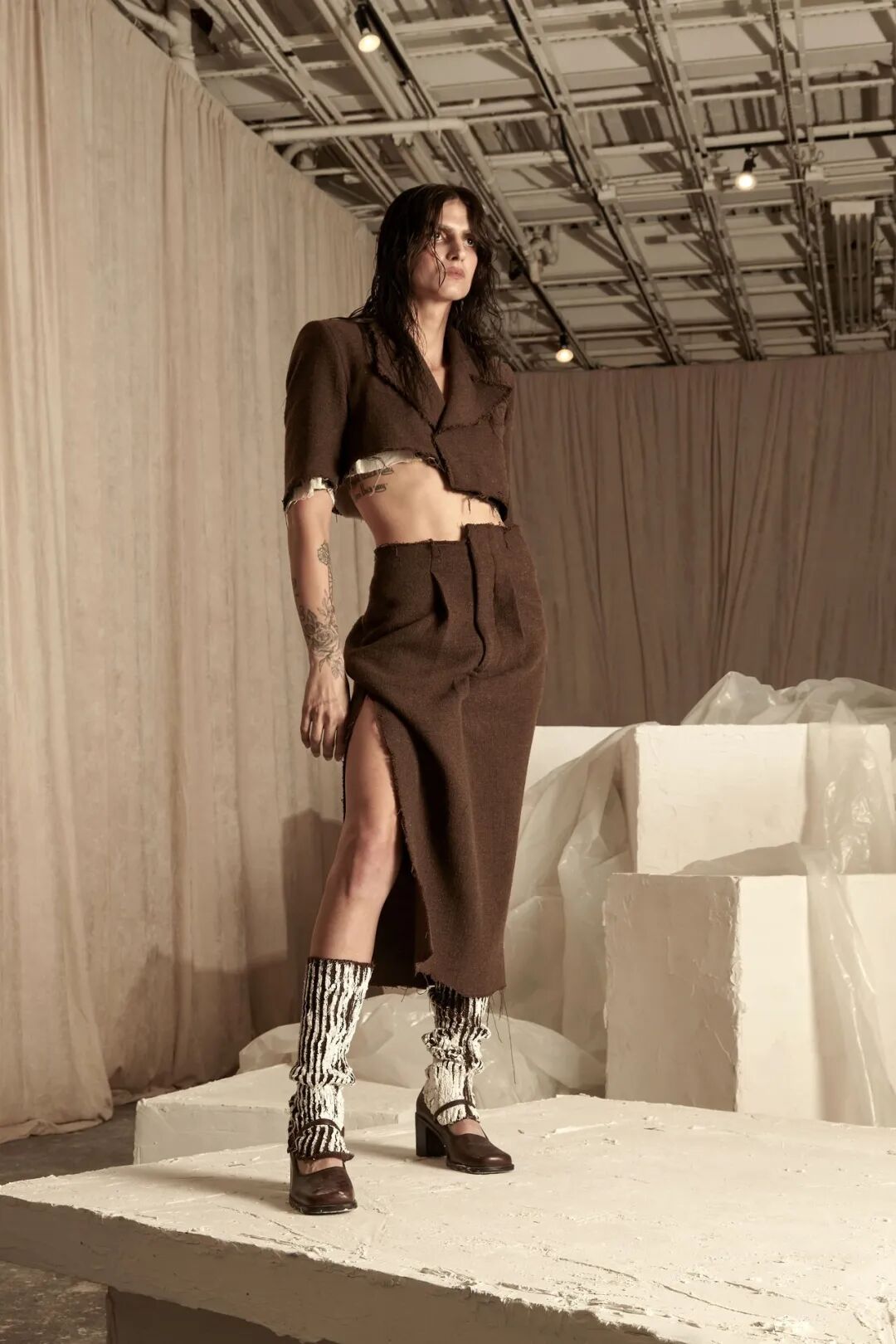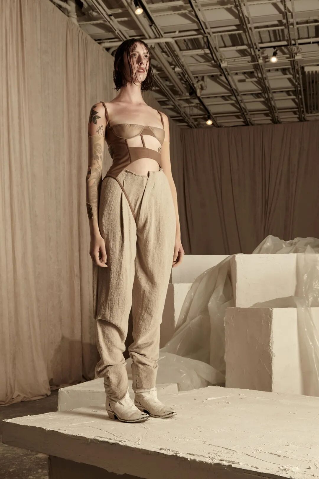 在本季中,Elena正式向大众介绍了品牌和它的跨学科合作宇宙。以蛮横主义和庞贝时代衰落的颓废文明作为灵感来源,Year 0思考了束缚与庇护之间的紧张关系,以及圈地二元性——既是盔甲又是陷阱的力量。