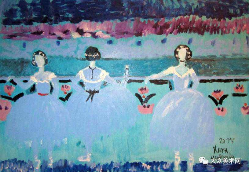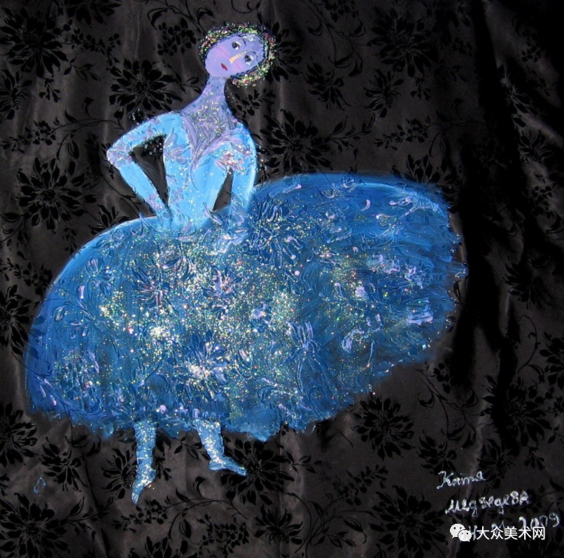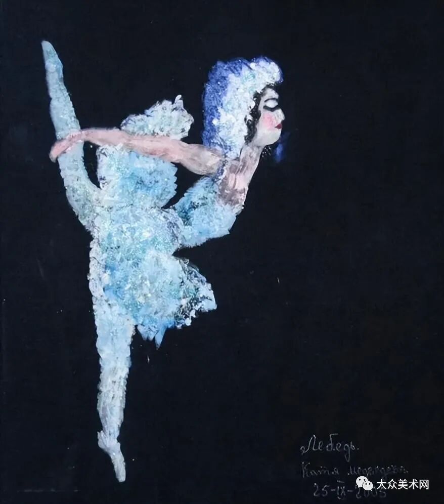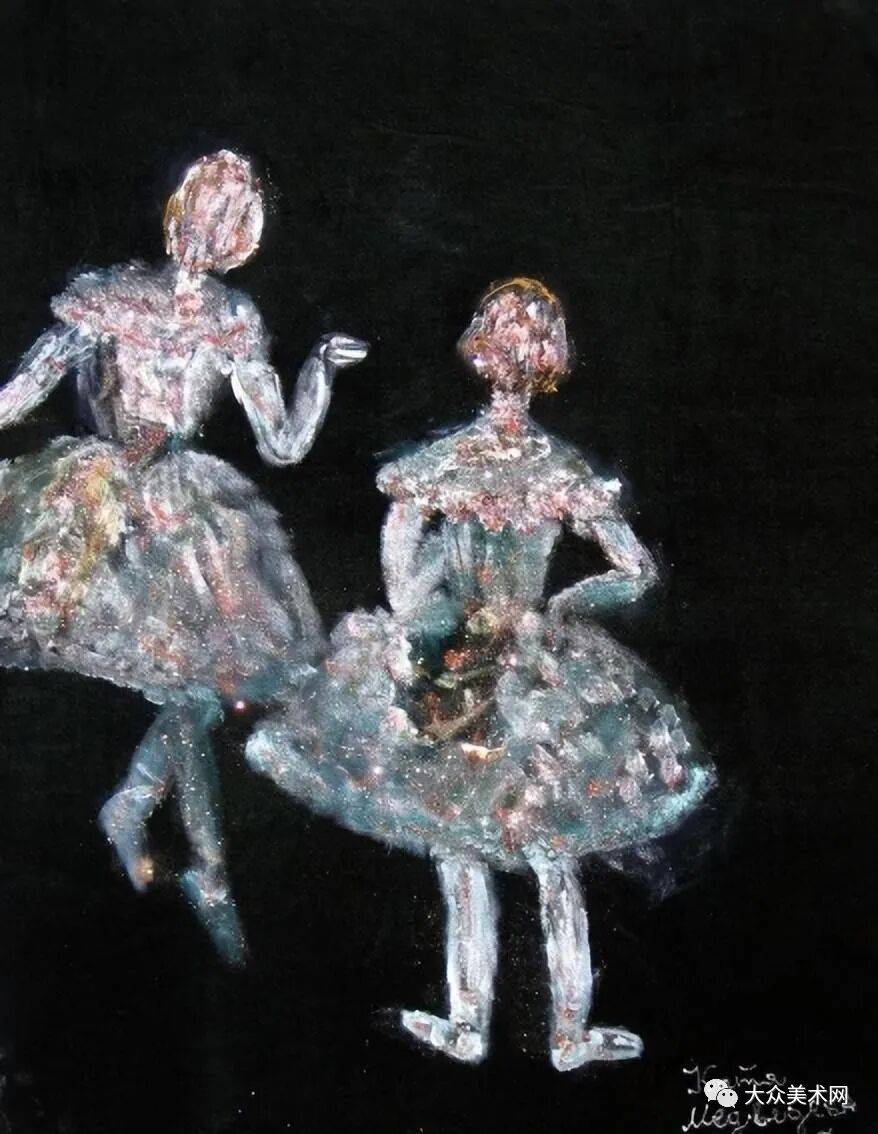 Medvedeva还绘制了大量的芭蕾舞者,身穿舞衣,轻踮脚尖,在暗色背景里闪闪发光,仿佛碰到了一个轻盈的梦。