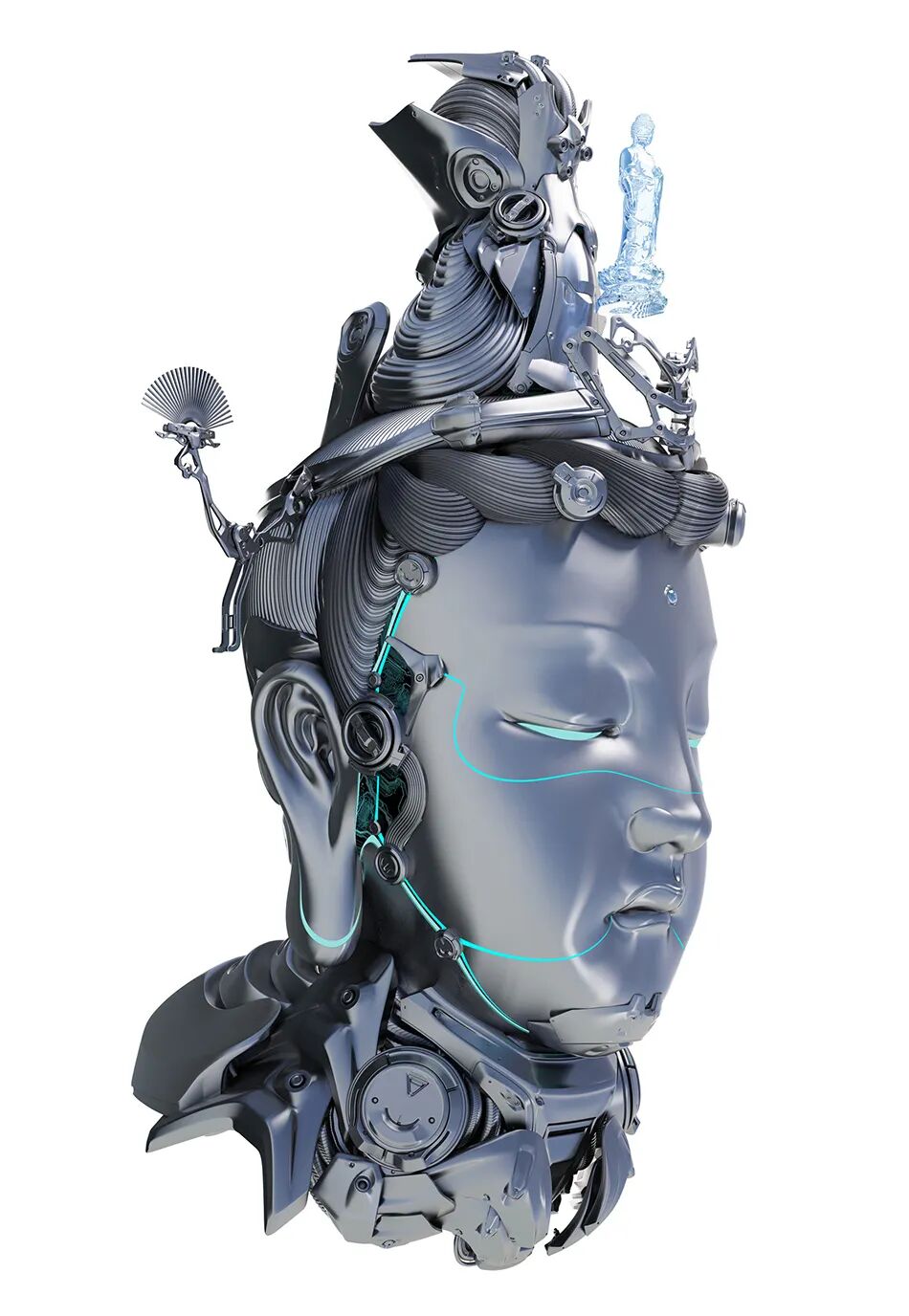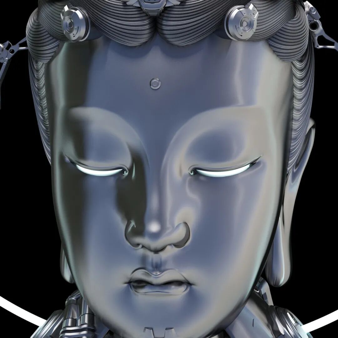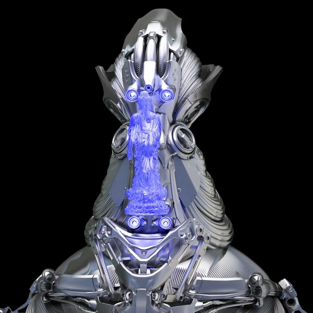 2015年,他在超然的虚拟世界,为佛造像,设想着“人通过机器成为神”。「未来仏」系列直击人心,过目不忘。