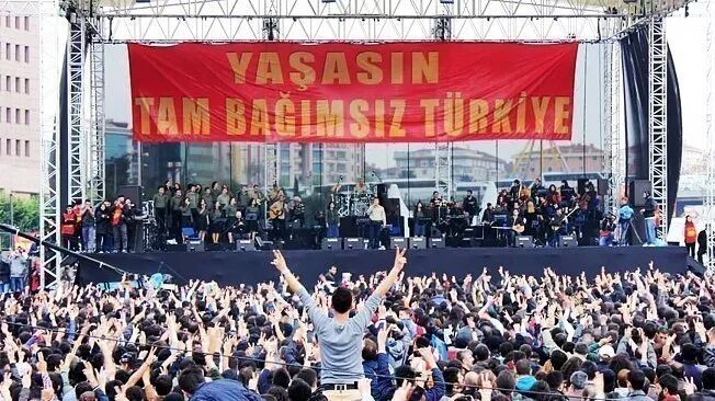 塔里克也以画作的形式支持了当地的抗议组织,并使用了 90 年代投递电报局并在大门举行街头抗议音乐会的人群为形式进行讽刺审查机制。