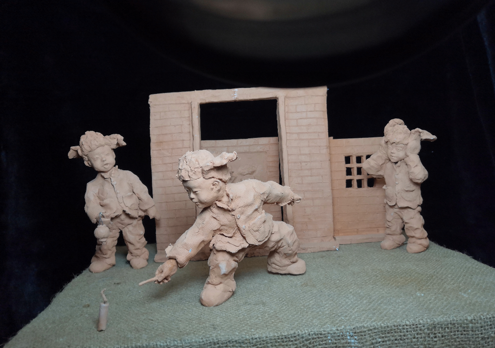 值得一提的是,这些泥塑作品,并没有添加任何颜料,泥塑小人白色的棉服红色的棉裤,是使用不同陶泥,加上调节烧制温度形成的自然色彩。接下来,就让我们一起来欣赏一下这些用陶土制作而成的有趣作品吧,看看这些场景是否与你的童年时光一样。