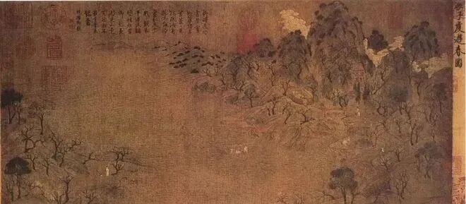 另一幅作品《游春图》,为隋代名家展子虔仅有的存世名作,是我国最流传至今最早的一幅山水绘画作品,距今1400多年。卷前有宋徽宗的题签,后方有董其昌、乾隆等历代藏家的数十枚收藏印迹,无疑为镇国之宝。