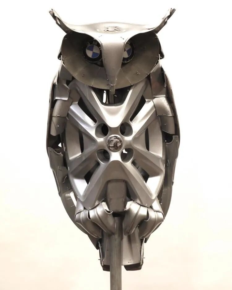 从事雕塑创作十多年的经验,让这位雕塑家的作品越来越精彩,让人感觉这些汽车轮毂,就是为了制作出这些雕塑作品量身打造的一样。