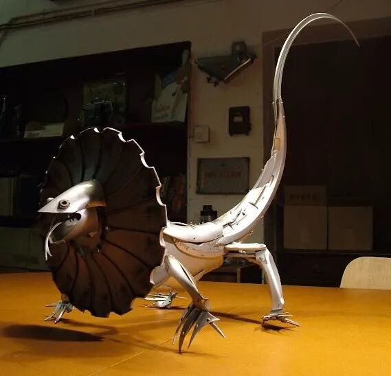 在这位雕塑家生活的周围,有很多废弃的汽车,他经常去回收这些废弃的汽车轮毂,然后再利用精湛的雕塑技艺和丰富的想象力,将这些汽车轮毂变成各种各样的动物。