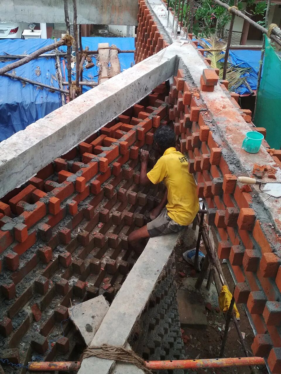 设计师采用了一种当地传统的砌墙方式来建造建筑,砖块垂直放置取代传统的水平放置,在墙内形成空腔,不仅可以提高热效率和减少用砖量,还十分适于隐藏构件和管道。