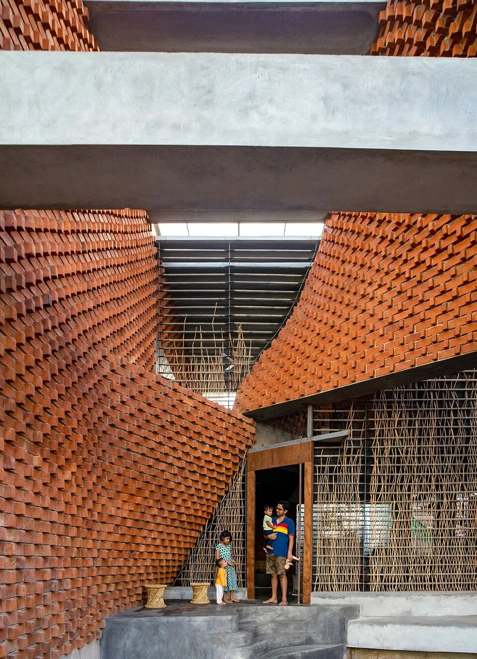 建筑的主入口面对庭院,房屋是东西向的对外开放空间,可以最大程度交互通风。主入口处,砖块垂直堆砌,形成曲面的墙壁造型。