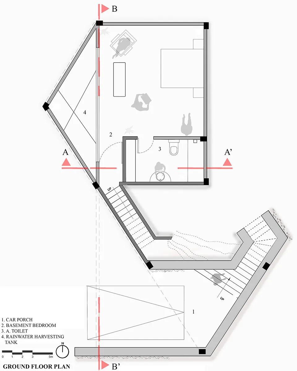 突出的红砖造型增加整个家的趣味性,沿着中庭楼梯,建筑的两侧设置了卧室和一些休闲公共空间。