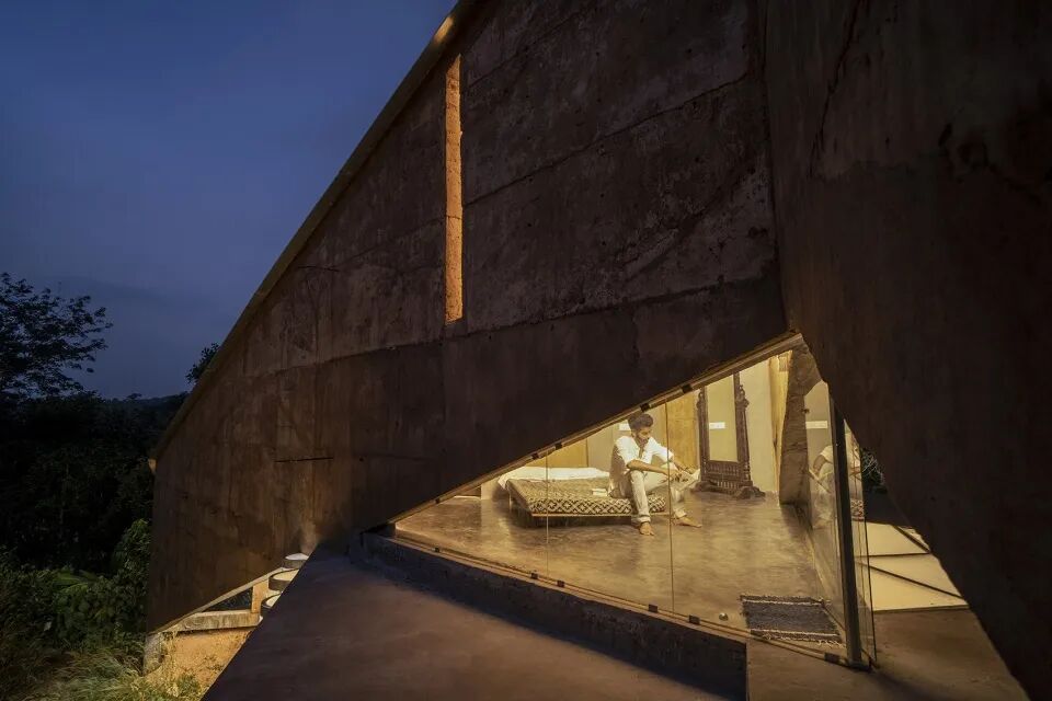 “The Ledge”住宅位于印度Peeremedu地区山崖边,整个住宅外形像是一块块山崖凸出来的山石岩层,像是从山体中延申出来。