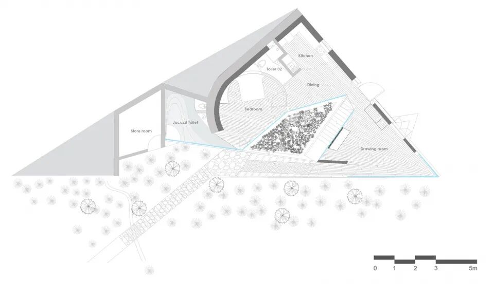 设计师受到东方禅宗花园的启发,产生了一个复合墙的想法,它围绕着树,向上扭曲,与房子的水泥屋顶无缝连接。