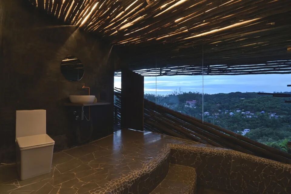 住宅内还配置浴池,这里也是一个天然放松的洗浴空间,浴室的一侧是开阔的玻璃窗,能看到整个山林。
