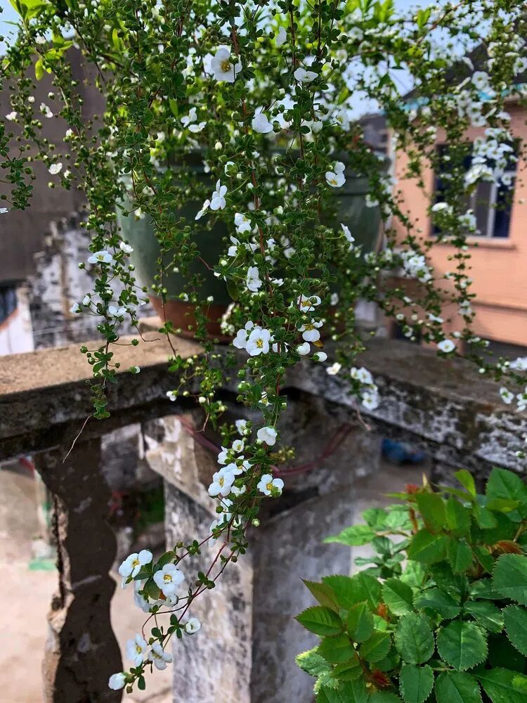 初春的露台喷雪花❄️,白色的,柔软的垂了下来,有谁能够想象到它冬季那枯黄的落叶呢?花开时只见花儿不见叶