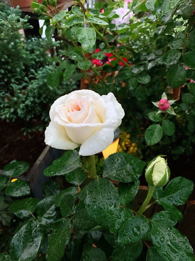 果然,傍晚时分,一场大雨把院子里的花草淋了个透,珍妮莫罗,唯一的一款白色月季,香气扑鼻