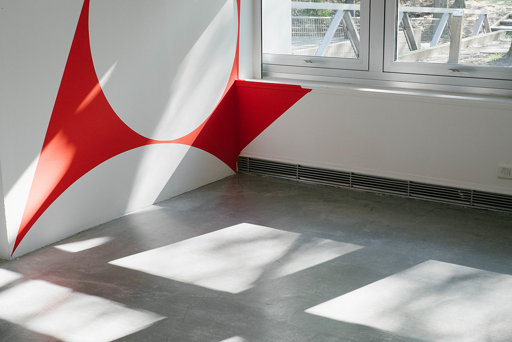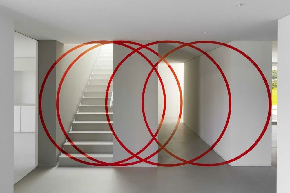 他的画作会有一个特定的“最佳视角”,只有从那里看去,观众才会看到完整的图形,这个图形往往是一个简单几何形(一个圆圈、正方形或三角形)。而如果从其他视角看去,观众看到的将是“破碎”的碎片化图形。