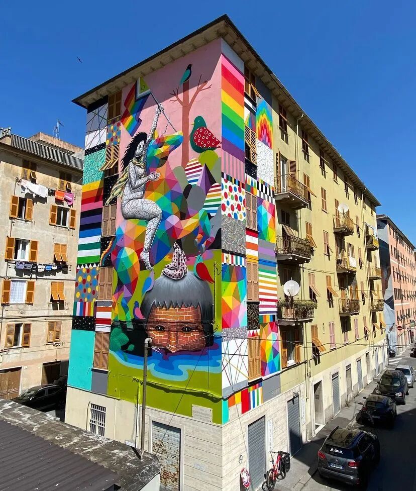 西班牙画家和雕塑家Okuda San Miguel,出生于1980年,毕业于马德里康普顿斯大学。从1997年开始进行艺术创作,作品逐渐演变成一种基于多色颜料的几何图案、有机形状、拟人化生物,标志性的图像遍布全球街头、铁路和废弃工厂,这使他成为当今最广为人知的西班牙艺术家之一。