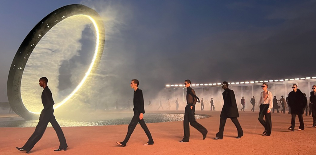 前两日,被Saint Laurent 2023男装秀场的一轮沙漠明月刷爆朋友圈。在摩洛哥阿格菲沙漠中心,一个巨大的金属环缓缓从中升起,如梦境般扑朔迷离挥洒着光芒。这超现实的场景,让人仿佛忘记这些模特还身处地球,充满虚无与神秘。