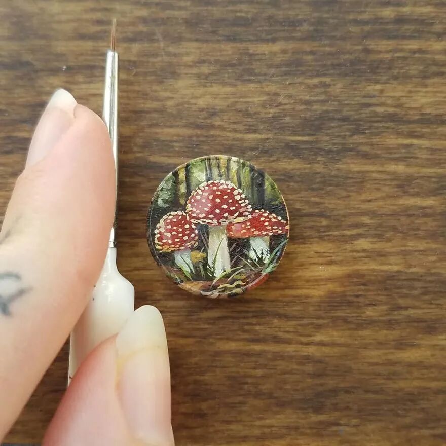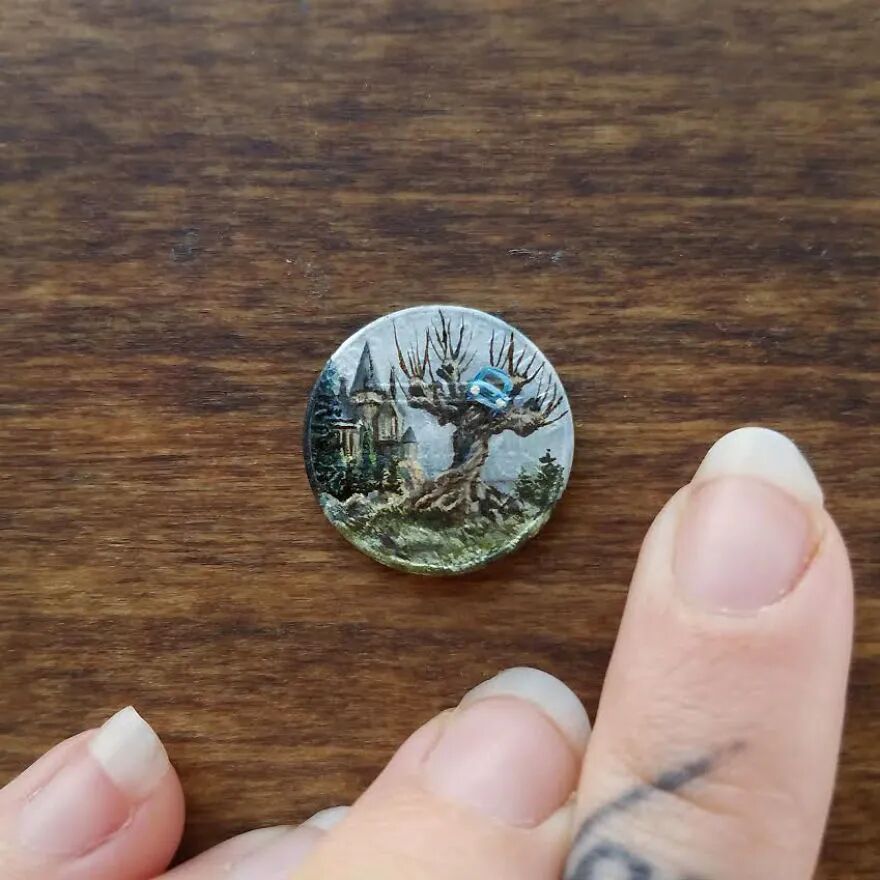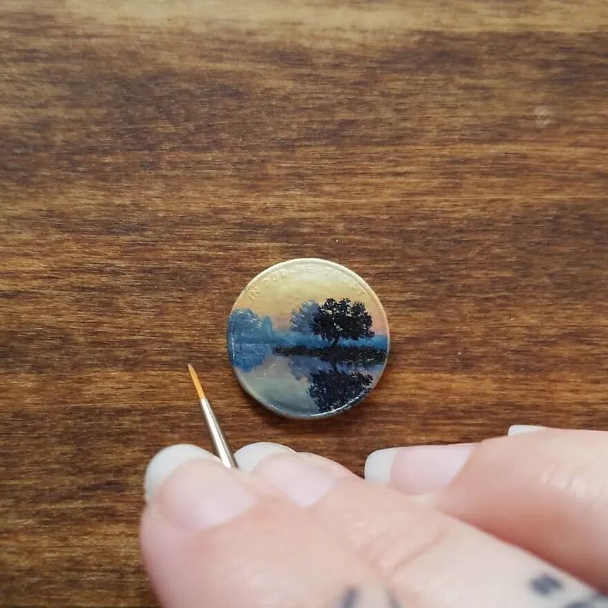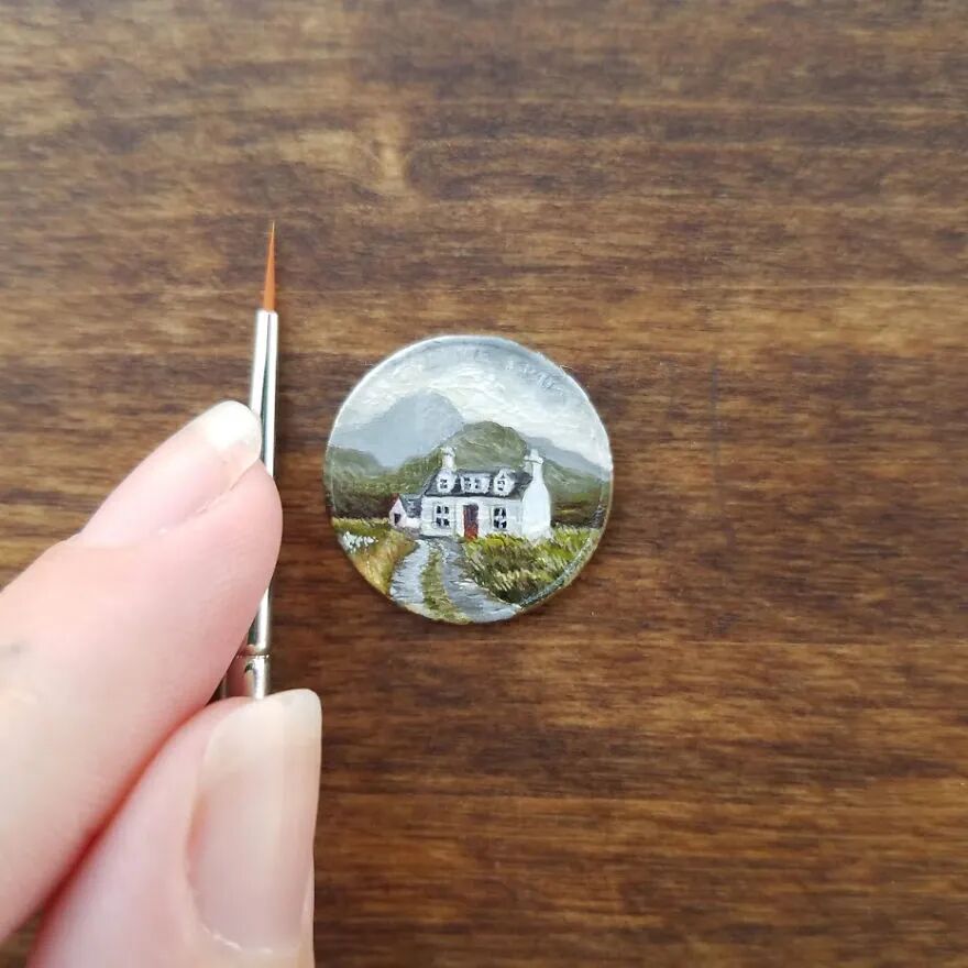 如果同时有多个绘画创意,那么她完成一件作品,就可能需要数周时间。为了磨炼绘画技能,这位艺术家经常突破自我,去挑战更小的绘画,在更小的空间上描绘更精致的细节,令她充满了成就感。最近,她就开始在硬币上作画了,一分钱的便士,是她选择的最佳创作材料。