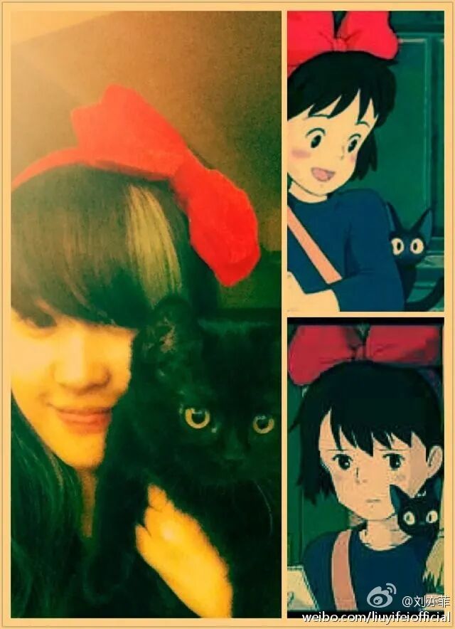 翻看她早年的微博,能看到她很生活化的一面,她爱猫,也爱晒猫,在她微博里,猫躺着、睡着、被她抱着,以各种方式入镜,有朋友送了她一个大红发卡,她抱着猫立刻cos了一把《魔女宅急便》里的琪琪。