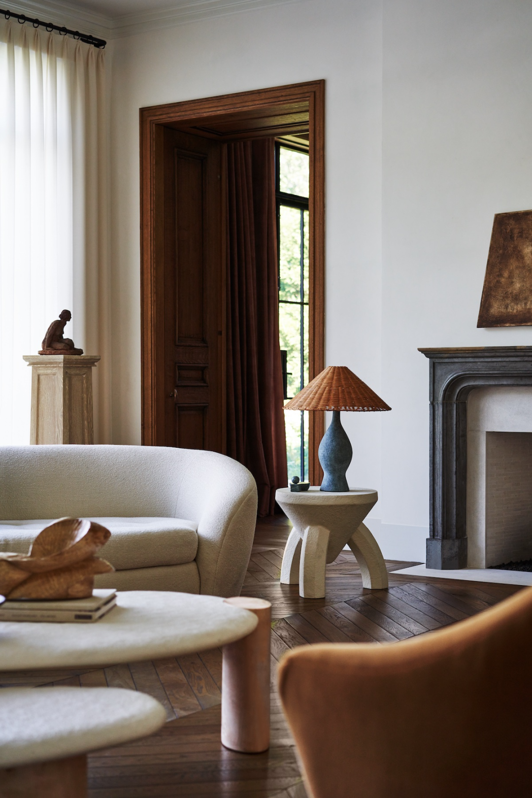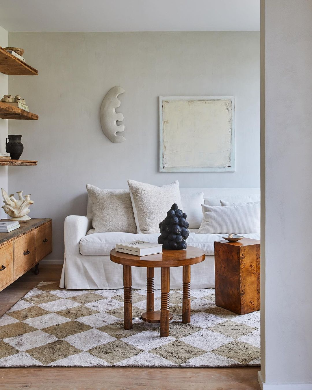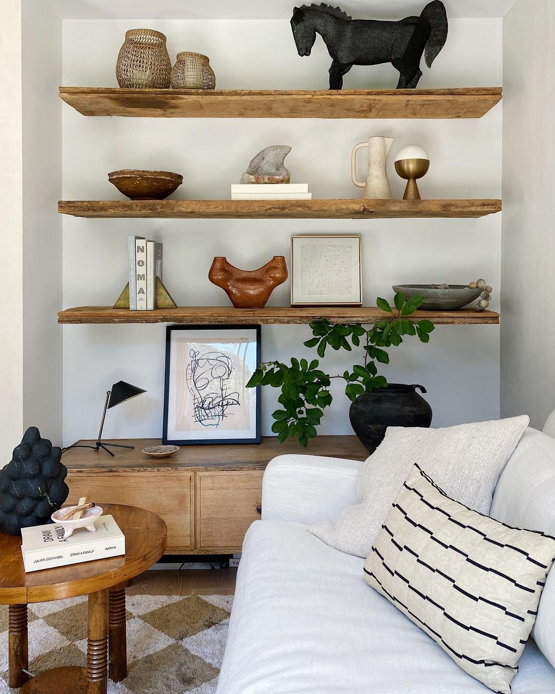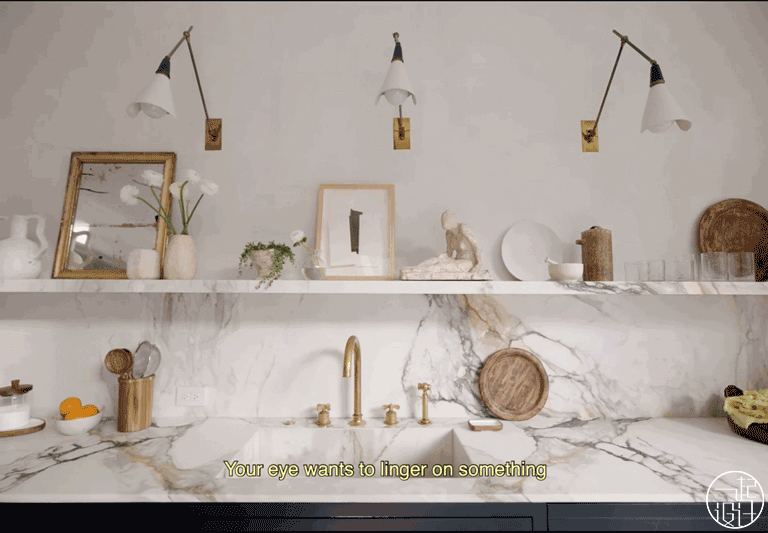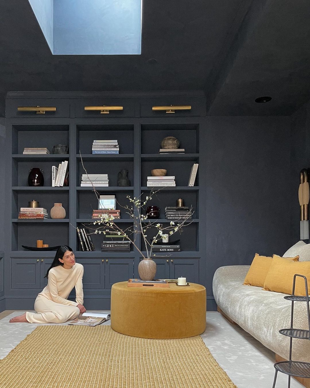 如何让休息室显得宁静诗意?Athena 选择采用开放式书架展示自己的艺术收藏品。