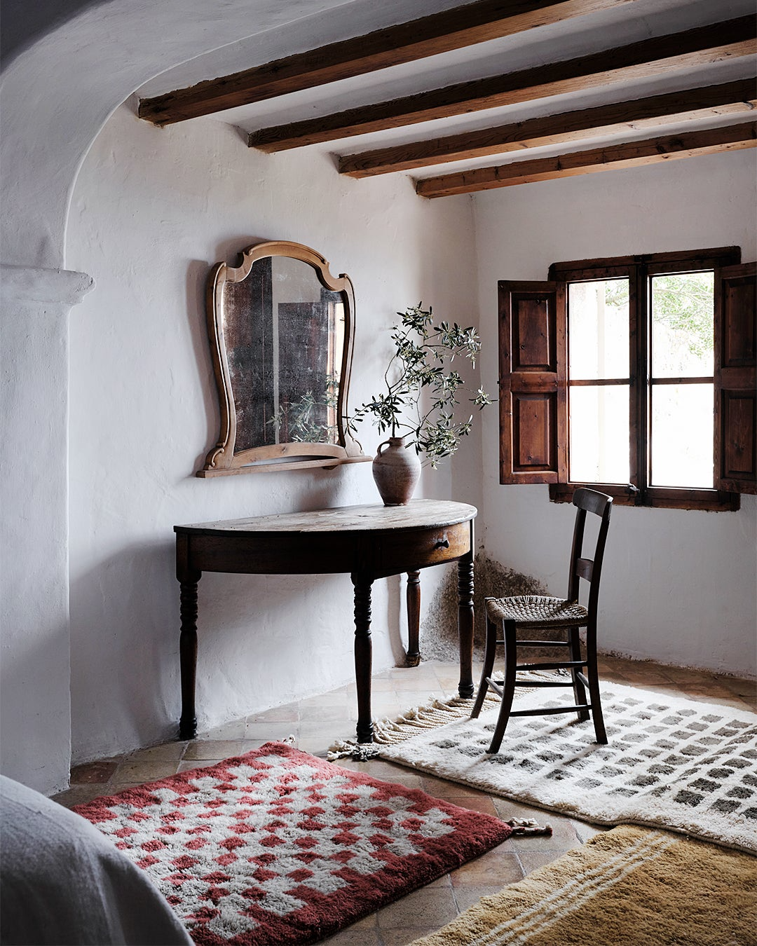 地毯的图案由不同颜色的几何体组合而成,象征着多元元素的碰撞。地毯均在摩洛哥手工编织,为每一张地毯带来独一无二且富有生命力的能量。