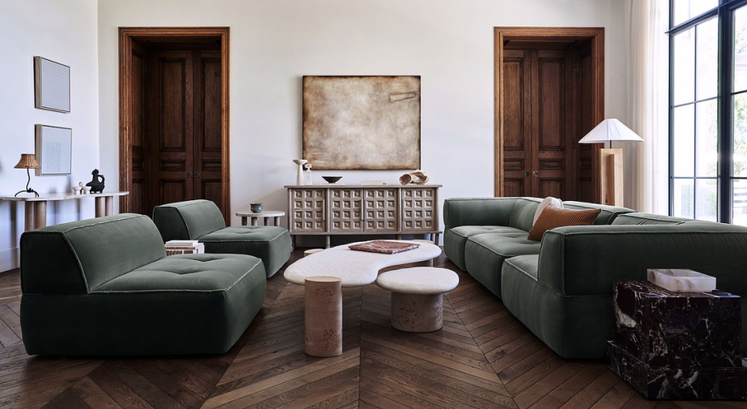 走进 Athena 设计的会客厅,沙发组合采用深绿色调,带来踏实安定的氛围基调。