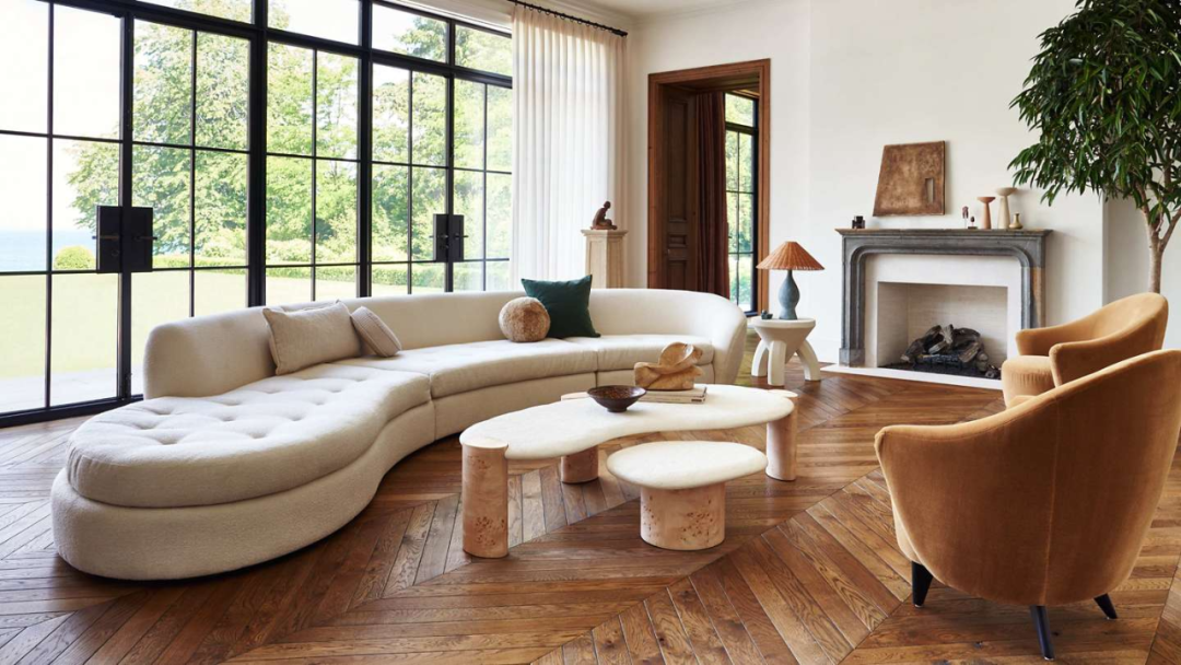 客厅场景里的米色弧形长沙发简约且具有个性,放在任一空间里都是使人过目不忘的经典造型。