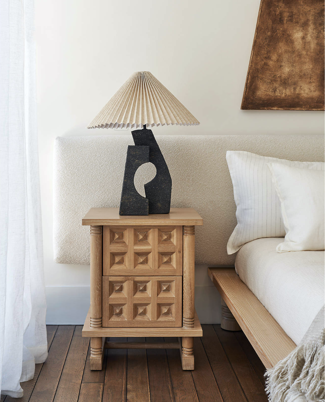 床头柜的两盏台灯造型简约却带有独特细节,折叠造型的灯罩带有复古的氛围,灯柱则采用了陶瓷材料增加立体感和精致感。
