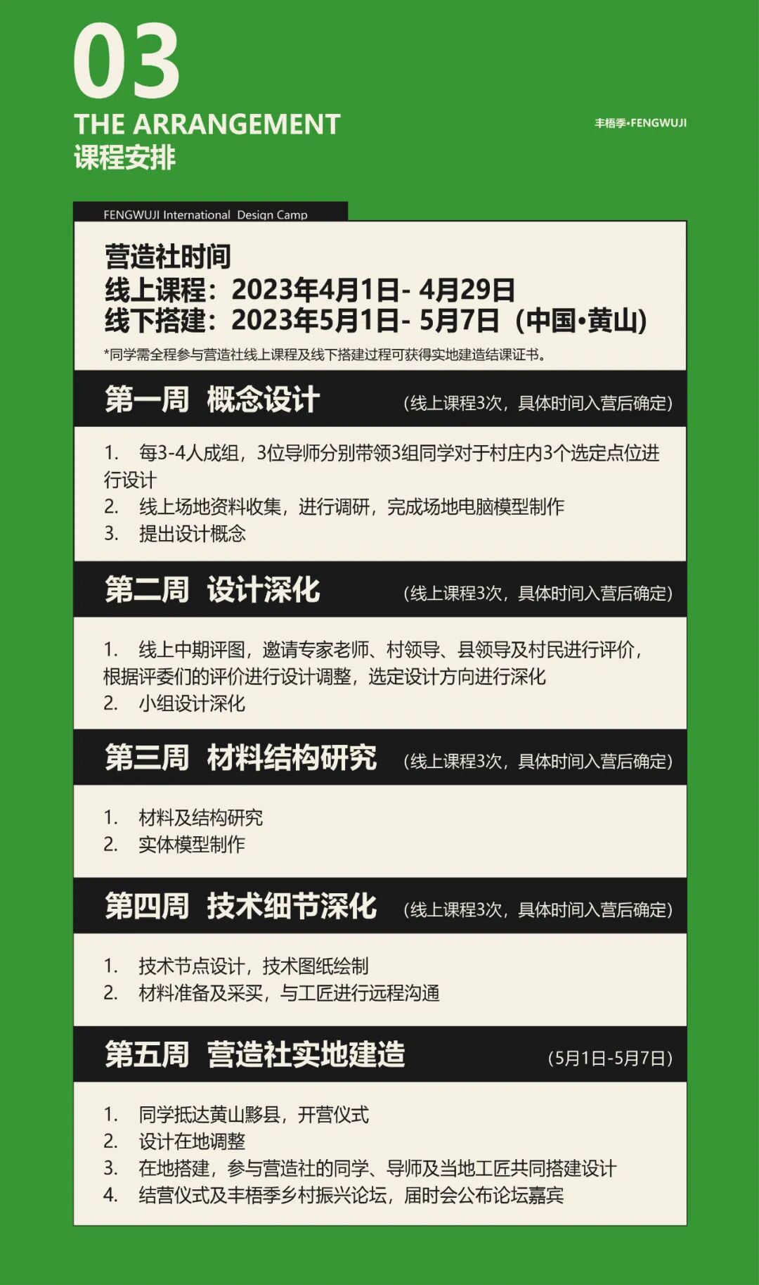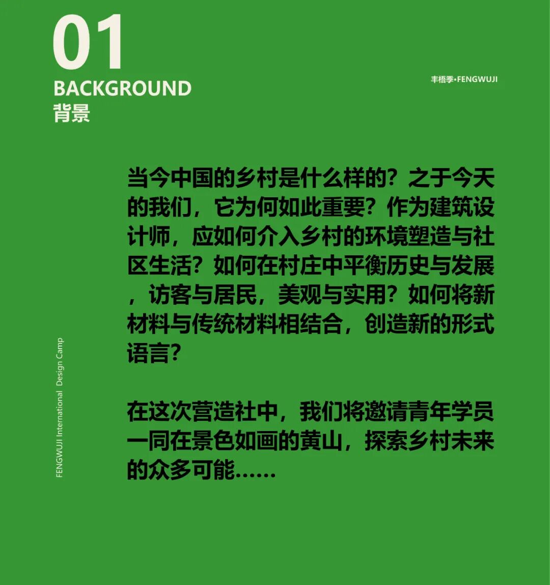丰梧季营造社是“丰梧季”乡村行动[1]的子项内容(黄山黟县百村计划之一),将由资深建筑师及艺术家作为导师,在当地政府和工匠的助力下,引导学员通过4周的线上课程以及1周的线下搭建,激活乡村空间。工作营开始前以及进行期间将举行线上及线下研讨会,与乡村振兴的各领域专家,以及在地居民一同探讨乡村振兴的路径。作品将会在红点设计博物馆·厦门、天府设计展览馆等设计文化机构进行展出。