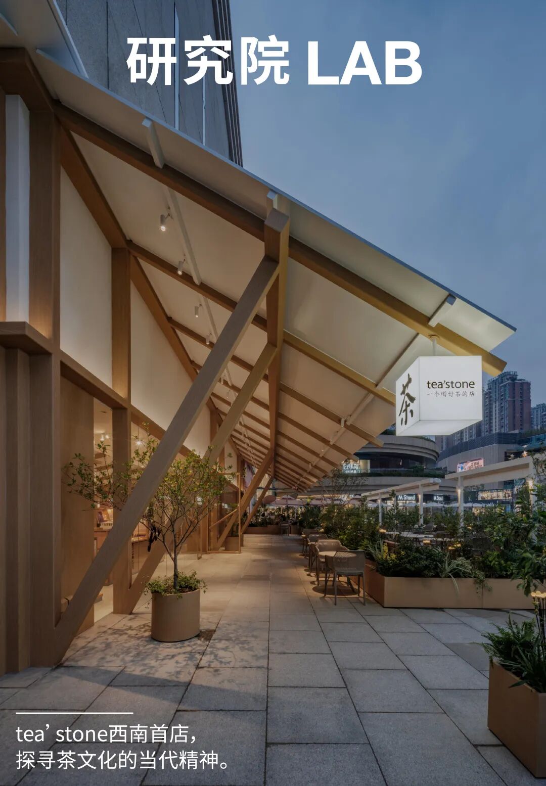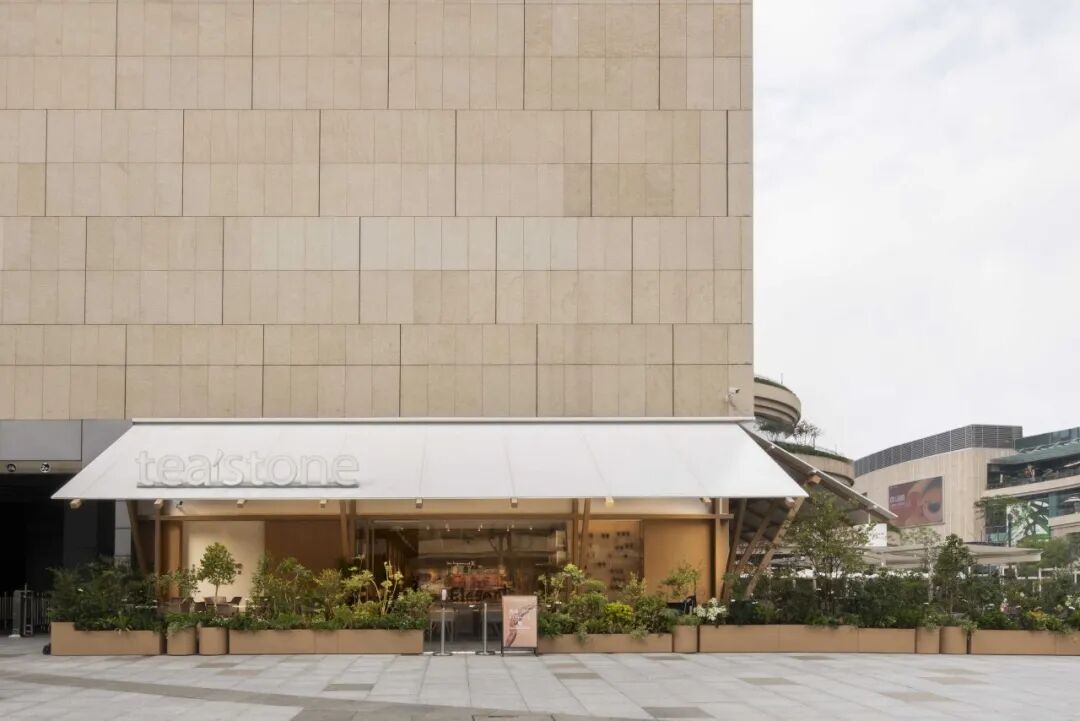 tea'stone成都店的外观设计便以茶铺的“斜撑凉棚”为创作灵感,轻盈灵动的浅色方木撑,结合tea'stone空间DNA中经典的纯白无饰大招展棚面设计,形成兼具中国记忆与当代美学的标志性空间符号。