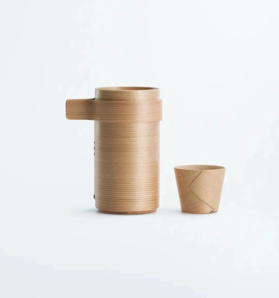 这是使用了秋田杉的传统工艺品“木制圆盒”的酒器。酒杯的特点是在弯木技术中制作起来十分困难的圆锥形。为了和秋田杉的酒桶酒一样可以闻到木材的香味,酒杯内侧未进行涂装加工,外侧考虑到会沾到口红所以进行了涂装。酒壶为了防止酒漏出,提高了底板的精度,为了方便拿取加上了防滑的手柄。