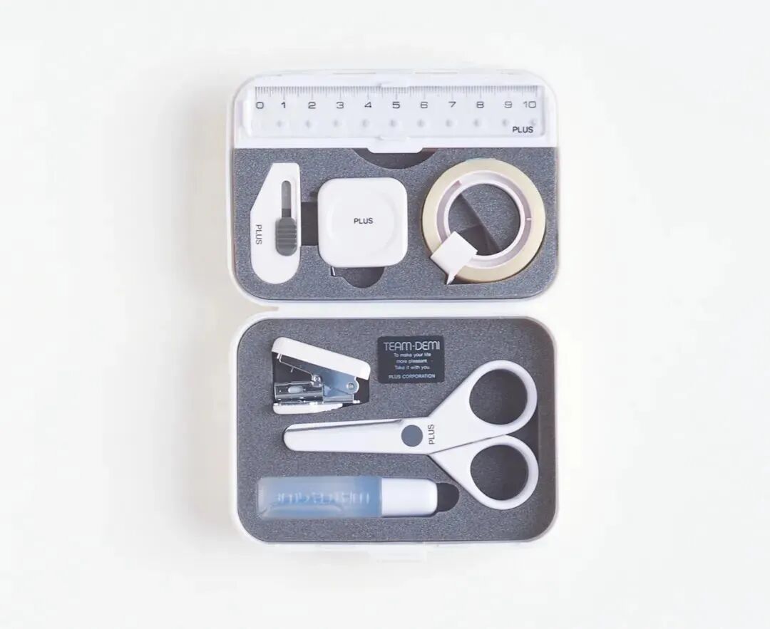 可在小盒中收入7小件不同的文具组合是这套文具的主要功能。文具类别按照剪切、粘贴、装订等不同作用的物品使用频率来决定。设计师不光考虑到每种文具,还对作为组合使用的乐趣也有所考量。