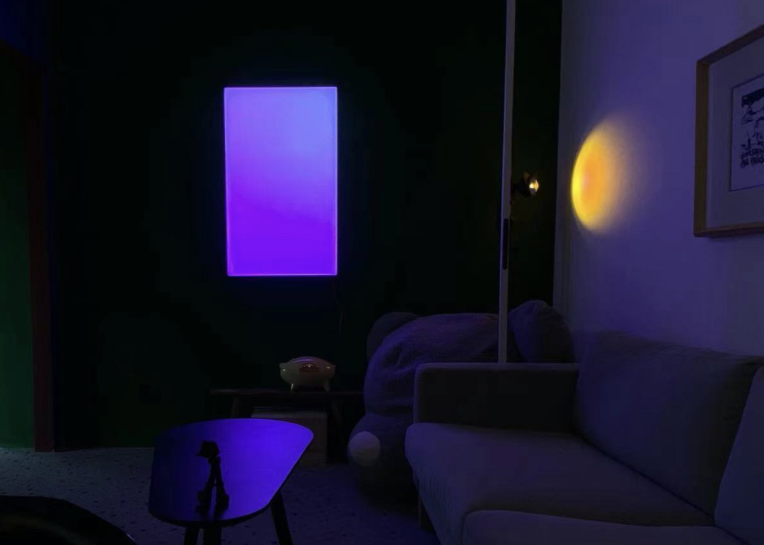 走进洞穴,名为GIF的灯光艺术装置映入眼帘,由与光共舞Dance with Light 艺术家梁贺LEGO 设计的装置控制着整个空间的明暗和颜色变化。GIF亮起的那一刻,伴随舒缓的音乐,灯光像缓慢飘动的彩色云朵不断变幻。循着导语的方向一路向前,内心的噪音渐息,从一呼一吸开始,注意力逐渐落在自我身上。这一刻脱离外界环境,紧张的神经慢慢放松,感受光和声音的变化,身体逐渐融入空间。短短90秒体验,人可以充分感受到环境和空间设计对自身状态带来的积极影响,提升自我意识,寻回在体验过程中所感知的平静与自洽。