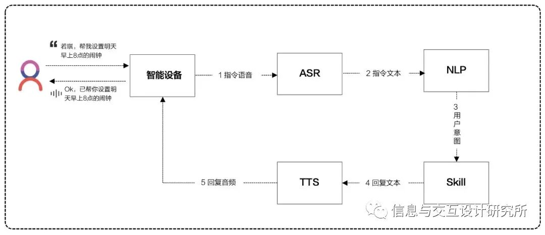 语音交互(VUI)指的是人类与设备通过自然语音进行信息的传递。一次完整的语音交互需要经历ASR→NLP→Skill→TTS的流程: