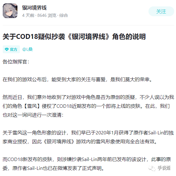 由于该形象的使用权经转手卖给了手游《银河警戒线》,所以画师第一时间还跟这款手游官方取得了联系,但是手游官方说并没有授权过动视公司。