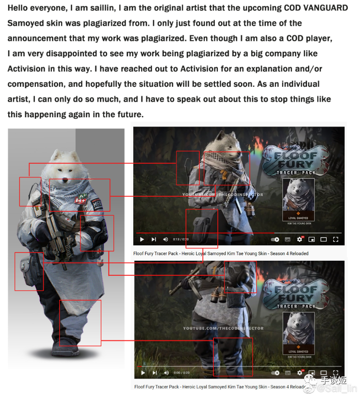 7月28日凌晨,国内画师saillin表示,动视抄袭了他2019年设计的人物形象。