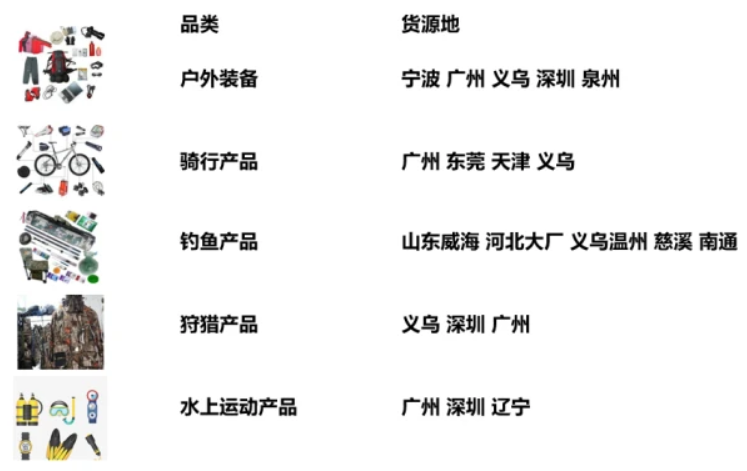 从户外运动出口区域来看,广州、深圳、义乌是户外运动出口的主要省市,其中广州出口的户外运动产品包括户外装备、骑行产品、水上运动产品等;深圳的户外运动出口产品包括户外装备、狩猎与水上运动。