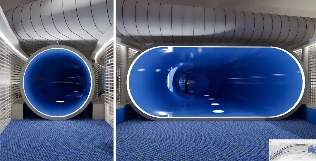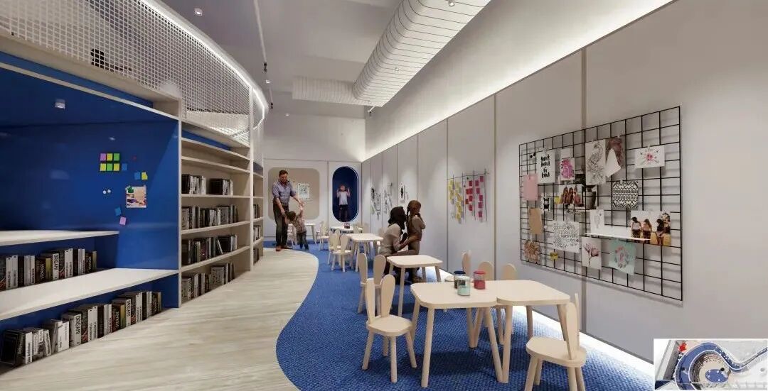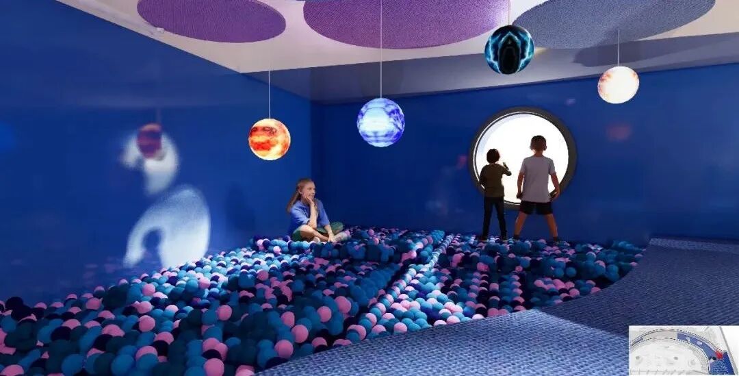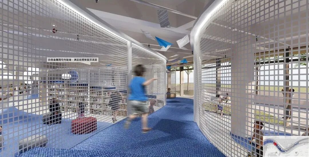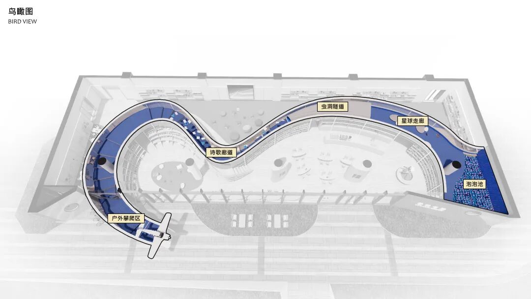 云梯两端分别是户外攀爬区和泡泡池,吸引孩子前往。虫洞隧道,它是一个由窄变宽的圆管,内部高度一米,供孩子爬行,也很好解决了层高问题。穿过虫洞来到星球廊道,这是个停留区,有软质的发光星球灯可以拍打。虫洞的另一端是诗歌长廊,长廊上方悬挂着孩子们写的关于航天的诗歌文章,白色的金属网可做展墙,保留充分的策展灵活性。
