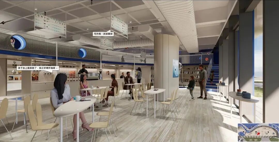 第二个区域是展览咖啡区,这是主入口进来的地方,公共性最强,同时也是云梯的两个出入口汇集的位置,方便家长观察孩子的安全。我们在这里做了两个场景,第一个是策展场景,天花上有一米*一米的模数轨道,用于安装可升降的展架,展架下端可固定在咖啡桌上。在没有展览的时候,我们设置了一个咖啡场景,展架升起来作为常设的广告位,家长也可以坐在咖啡区等云梯上玩耍的小朋友。