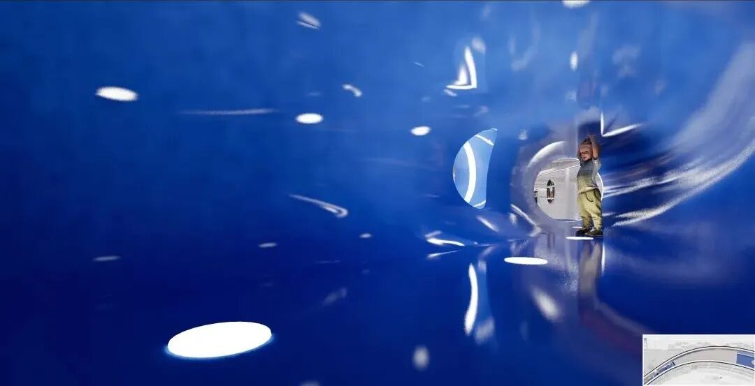 文创五维走廊位于云梯下方,无限延伸的镜面视觉是为了致敬“星际穿越”的剧情,男主库克通过无限延伸的五维空间,连接到了女儿房间的书架,用摩丝代码给女儿提供了关键线索。这是一个关于大人和孩子爱的连接的故事。
