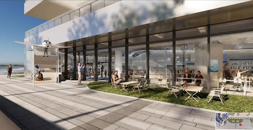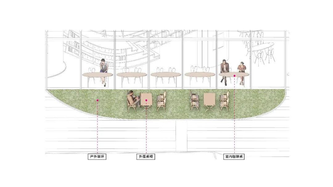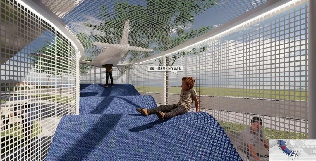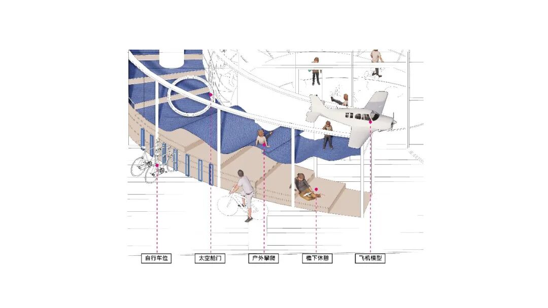 放大这里的结构,云梯的室外部分变成了起伏的飘带,孩子可以攀爬进入飞机内部。飘带下方是休憩区和给环湖骑行人预留的自行车位。在门头的中段,我们把景观换成了草坪外摆,增加落地窗的通透性。